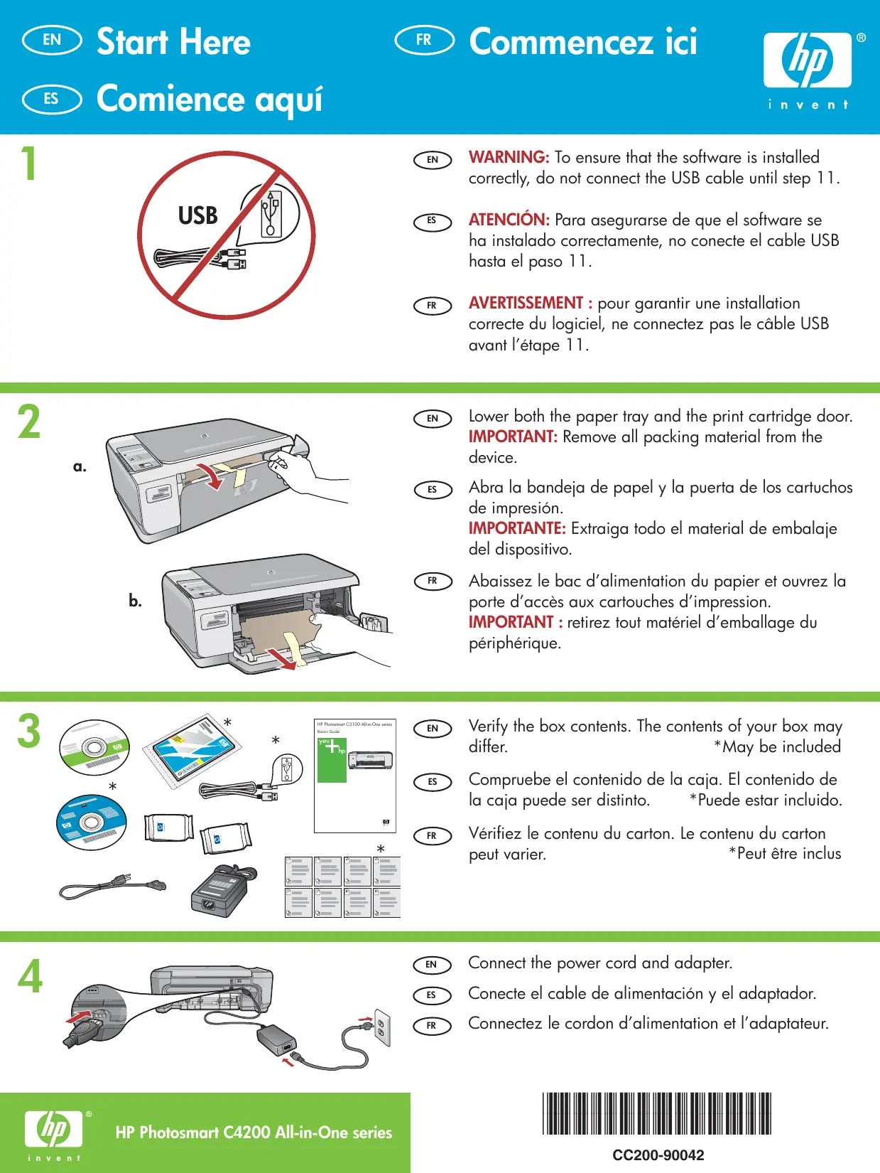 2 • HP Photosmart C4200 All-in-One series a Press On and wait for the language prompt. b To set the language, select your language, press OK, and confirm. Select your country/region, press OK and confirm. a Presione Encender y espere a que aparezca el indicador de idioma. b Para configurar el idioma, seleccione su idioma, presione OK, y confírmelo. Seleccione el país/región, presione OK y confírmelo. a Appuyez sur le bouton Marche et attendez l’invite de langue. b Pour définir la langue, sélectionnez la langue souhaitée, appuyez sur OK, puis confirmez votre sélection. Sélectionnez votre pays/région, appuyez sur OK, puis confirmez votre sélection. Pull out the tray extender, and then load plain white paper. Press OK. Saque el extensor de la bandeja y cargue papel blanco normal. Presione OK. Déployez la rallonge du bac et chargez du papier blanc ordinaire. Appuyez sur OK. Open the print cartridge door. Make sure the print carriage moves to the right. If it does not move to the right, turn the device off, then turn it back on again. IMPORTANT: The device must be turned on to insert cartridges. Abra la puerta de los cartuchos de impresión. Asegúrese de que el carro de impresión se mueve hacia la derecha. Si no se desplaza hacia la derecha, apague el dispositivo y vuélvalo a encender. IMPORTANTE: Para insertar los cartuchos, el dispositivo debe estar encendido. Ouvrez la porte d’accès aux cartouches d’impression. Assurez-vous que le chariot d’impression se déplace bien vers la droite du périphérique. Si ce n’est pas le cas, éteignez le périphérique, puis rallumez-le. IMPORTANT : pour insérer les cartouches d’impression, le périphérique doit être allumé.