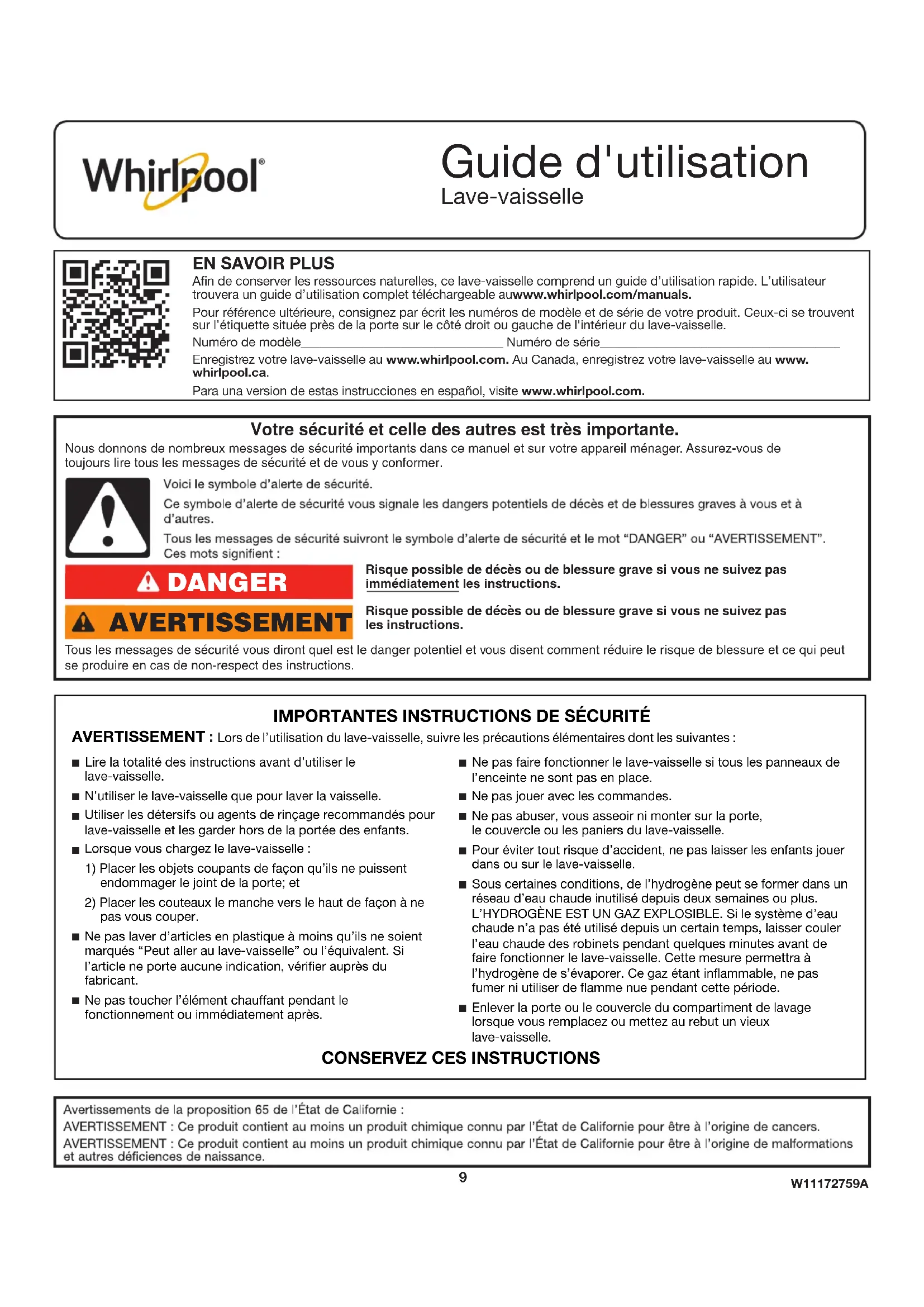 An de conserver les ressources naturelles, ce lave-vaisselle comprend un guide d’utilisation rapide. L’utilisateur trouvera un guide d’utilisation complet téléchargeable auwww.whirlpool.com/manuals.Pour référence ultérieure, consignez par écrit les numéros de modèle et de série de votre produit. Ceux-ci se trouvent sur l’étiquette située près de la porte sur le côté droit ou gauche de l'intérieur du lave-vaisselle. Numéro de modèle________________________________ Numéro de série______________________________________ Enregistrez votre lave-vaisselle au www.whirlpool.com. Au Canada, enregistrez votre lave-vaisselle au www. whirlpool.ca.Para una version de estas instrucciones en español, visite www.whirlpool.com.Risque possible de décès ou de blessure grave si vous ne suivez pas immédiatement les instructions.Risque possible de décès ou de blessure grave si vous ne suivez pas les instructions. Tous les messages de sécurité vous diront quel est le danger potentiel et vous disent comment réduire le risque de blessure et ce qui peut se produire en cas de non-respect des instructions. Votre sécurité et celle des autres est très importante. Nous donnons de nombreux messages de sécurité importants dans ce manuel et sur votre appareil ménager. Assurez-vous de toujours lire tous les messages de sécurité et de vous y conformer. AVERTISSEMENT DANGER