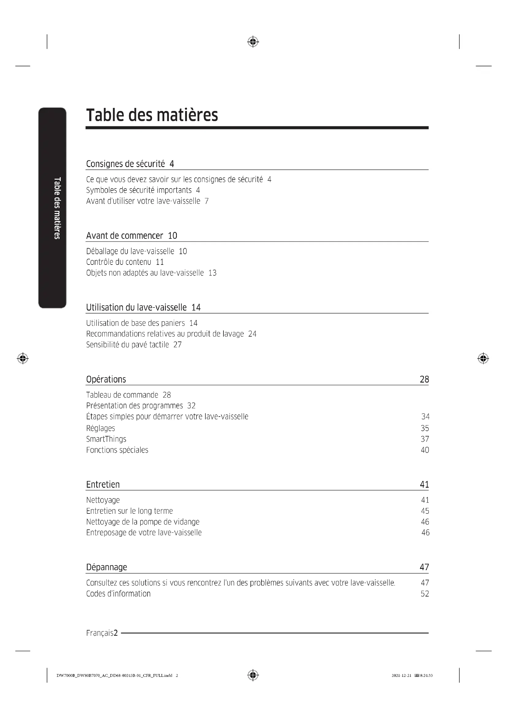 - Ne réparez pas et ne remplacez pas vous-même les éléments du lave-vaisselle. Le démontage, les réparations et les modifications ne doivent être effectués que par des techniciens de maintenance agréés. Toute intervention de la part d'une personne non autorisée risque d'annuler la garantie. DW7000B_DW80B7070_AC_DD68-00243B-01_CFR_FULL.indd 6 2021-12-21 8:24:33Français 7