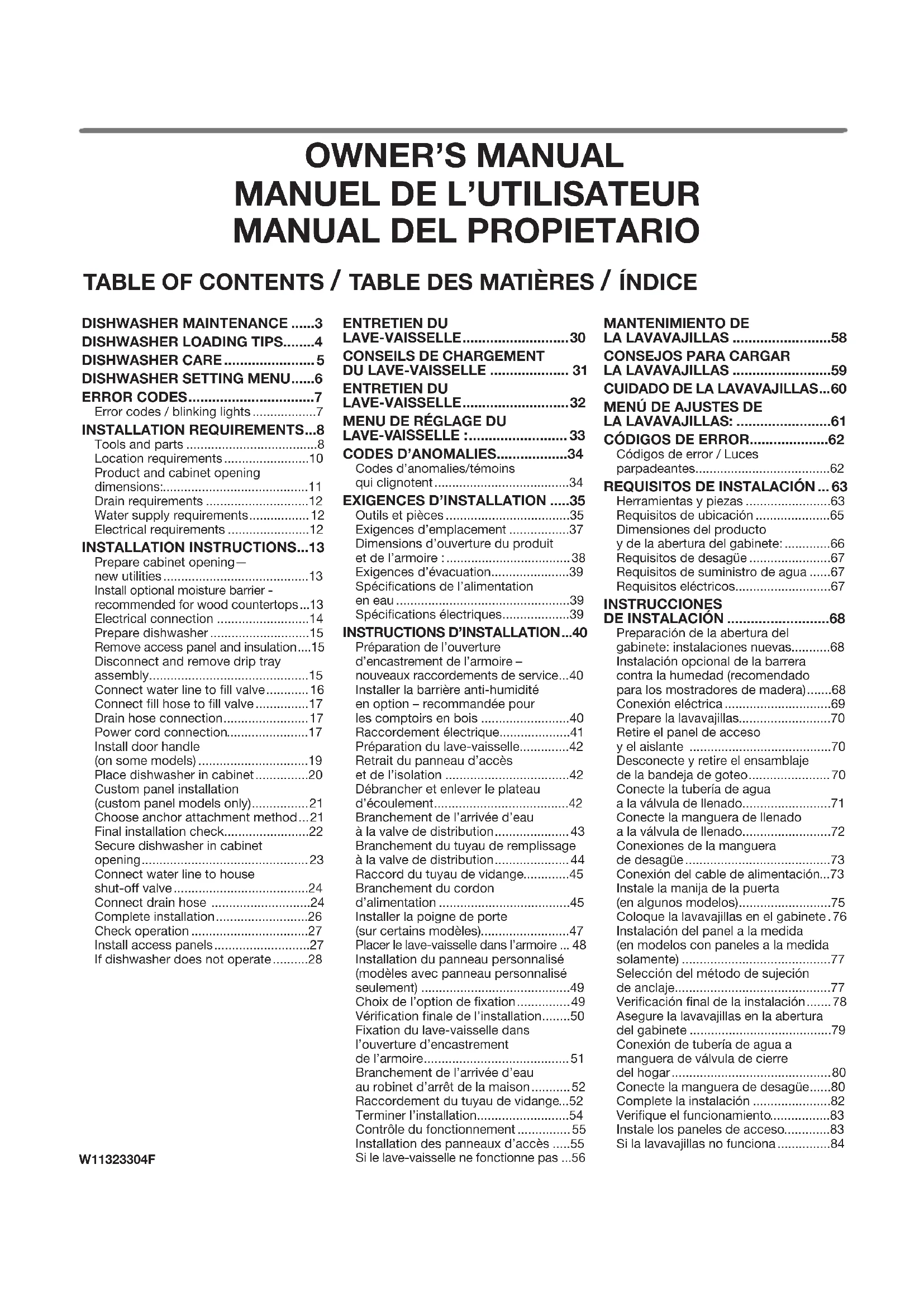 L’appareil doit être entièrement encastré (sur le dessus, les côtés, à l’arrière et au sol) dès l’installation. Un ensemble de panneaux latéraux est disponible chez votre marchand pour l’installation du lave-vaisselle à l’extrémité d’une rangée d’armoires. Une barrière anti-humidité en option est également offerte pour l’installation sous un plan de travail en bois. Inspecter l’emplacement d’installation du lave-vaisselle. Il doit comporter les caractéristiques suivantes: ■ Accès facile pour chargement et déchargement de la vaisselle. Dans le cas de l’installation dans un angle, on doit pouvoir établir un dégagement de 2po (5,1cm) ou plus entre le côté de la porte du lave-vaisselle et le mur ou l’armoire. ■ Facilité d’accès aux canalisations d’eau et d’évacuation et à la source d’électricité: ■ Une source d’électricité avec liaison à la terre est nécessaire. ■ Ce lave-vaisselle est doté d’une fonction de chauffage de l’eau et doit être raccordé à la canalisation d’alimentation en eau chaude. ■ Veiller à ce que les canalisations d’eau et d’évacuation et les câbles électriques se trouvent dans les limites de la zone marquée en gris illustrée dans la section «Dimensions du produit et de l’emplacement d’installation». ■ Ne pas placer de canalisation d’évacuation, canalisation d’eau ou câblage électrique à un endroit où cela susciterait interférence ou contact avec les pieds ou les moteurs du lave-vaisselle. ■ Protéger du gel le lave-vaisselle et les canalisations d’eau qui l’alimentent. La garantie de l’appareil ne couvre pas les dommages imputables au gel. REMARQUE: Si le lave-vaisselle ne doit pas être utilisé pendant une période prolongée ou s’il est laissé à un endroit qui pourrait être exposé au gel, veiller à faire exécuter les opérations de préhivernage par un technicien compétent. ■ S’il est installé dans une nouvelle construction, enlever tout débris de l’arrivée d’eau avant de la brancher à la valve de distribution. Les débris qui ne sont pas enlevés de l’eau pourraient obturer le filtre de la valve de distribution. ■ Une ouverture carrée offrant l’esthétique appropriée et permettant un fonctionnement correct. ■ La façade des armoires perpendiculaire au plancher. ■ Plancher de niveau. Conseil utile: S’il y a un écart de niveau sur le plancher entre l’avant et l’arrière de l’emplacement d’installation, il pourrait être nécessaire d’utiliser des cales pour établir l’aplomb de l’appareil. REMARQUE: Pour éviter tout déplacement des cales durant le fonctionnement du lave-vaisselle, les cales doivent être solidement fixées au plancher. ■ À l’emplacement d’installation du lave-vaisselle, on doit pouvoir établir le dégagement approprié entre le moteur et le plancher. Les moteurs ne doivent pas toucher le plancher. ■ Ne pas installer le lave-vaisselle par-dessus un tapis.38 DIMENSIONS D’OUVERTURE DU PRODUIT ET DE L’ARMOIRE:
