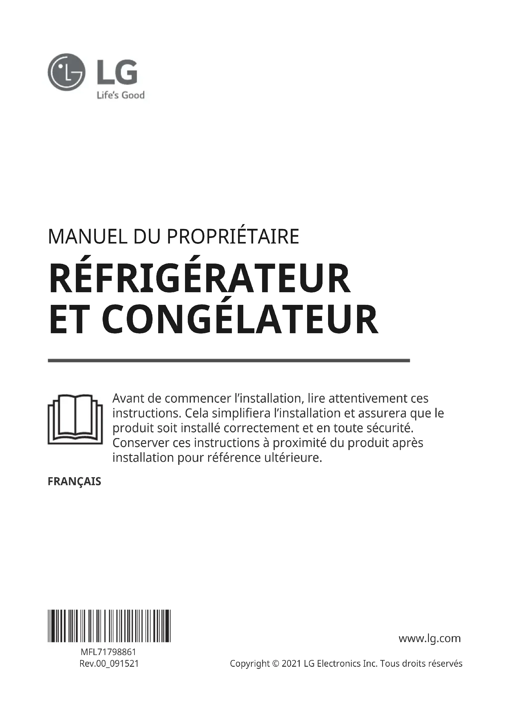 Avant de commencer l’installation, lire attentivement ces instructions. Cela simplifiera l’installation et assurera que le produit soit installé correctement et en toute sécurité. Conserver ces instructions à proximité du produit après installation pour référence ultérieure. FRANÇAIS MFL71798861 Rev.00_091521 www.lg.com Copyright © 2021 LG Electronics Inc. Tous droits réservésTABLE DES MATIÈRES Ce manuel peut contenir des images ou un contenu différent du modèle que vous avez acheté. Ce manuel est sujet à révision par le fabricant.