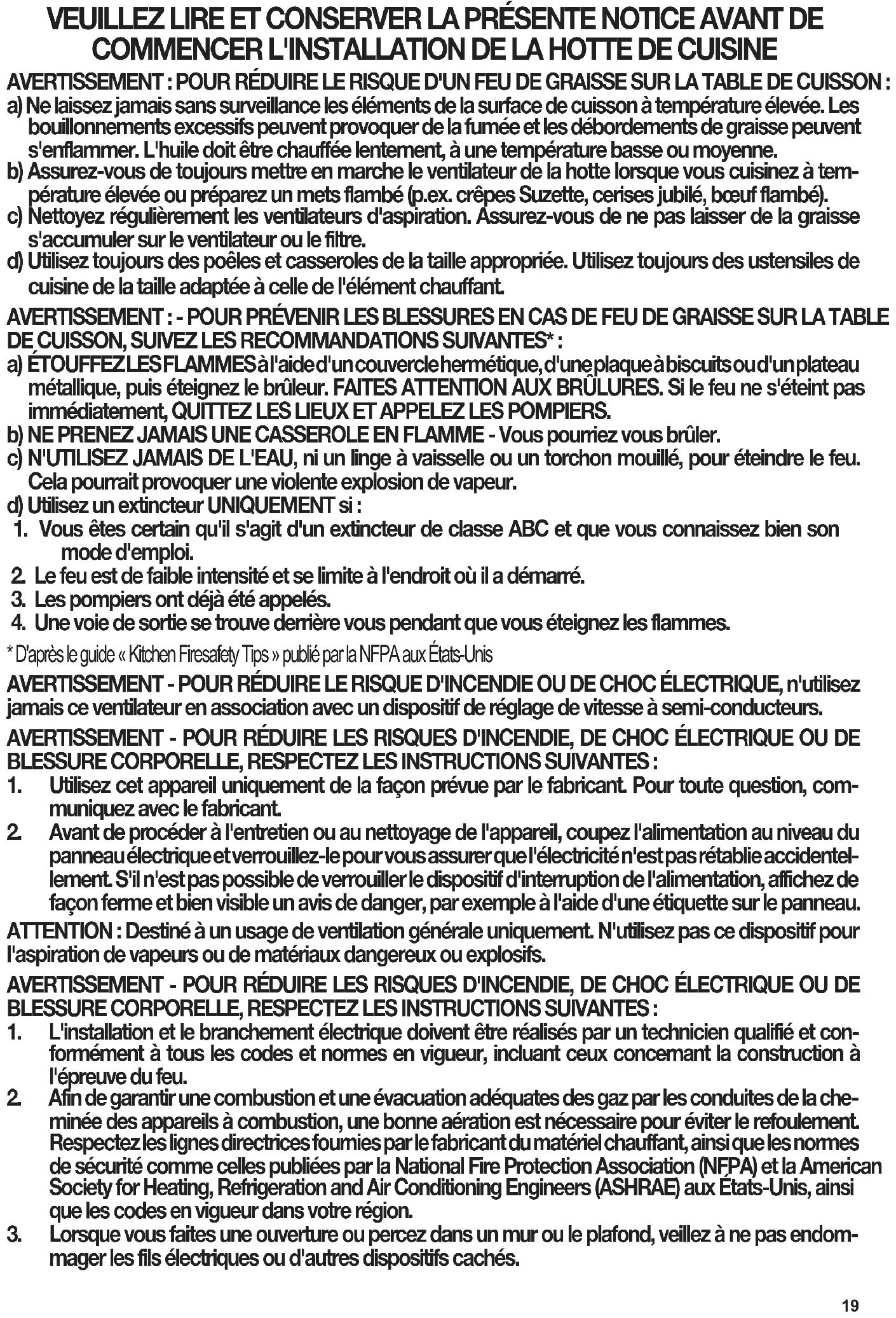- D'après le guide « Kitchen Firesafety Tips » publié par la NFPA aux États-Unis AVERTISSEMENT - POUR RÉDUIRE LE RISQUE D'INCENDIE OU DE CHOC ÉLECTRIQUE, n'utilisez jamais ce ventilateur en association avec un dispositif de réglage de vitesse à semi-conducteurs. AVERTISSEMENT - POUR RÉDUIRE LES RISQUES D'INCENDIE, DE CHOC ÉLECTRIQUE OU DE BLESSURECORPORELLE,RESPECTEZLESINSTRUCTIONSSUIVANTES: