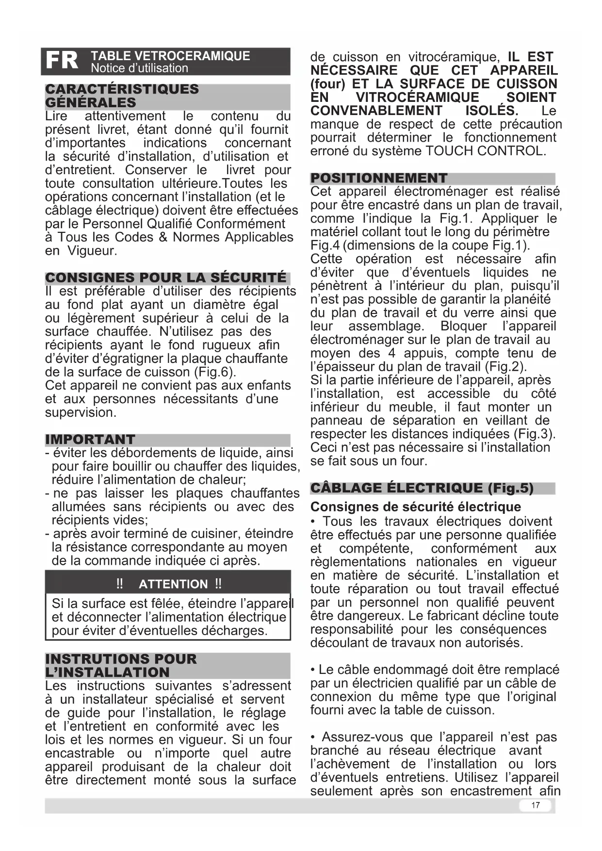 de cuisson en vitrocéramique, IL EST NÉCESSAIRE QUE CET APPAREIL (four) ET LA SURFACE DE CUISSON EN VITROCÉRAMIQUE SOIENT CONVENABLEMENT ISOLES. Le manque de respect de cette précaution pourrait déterminer le fonctionnement erroné du système TOUCH CONTROL.