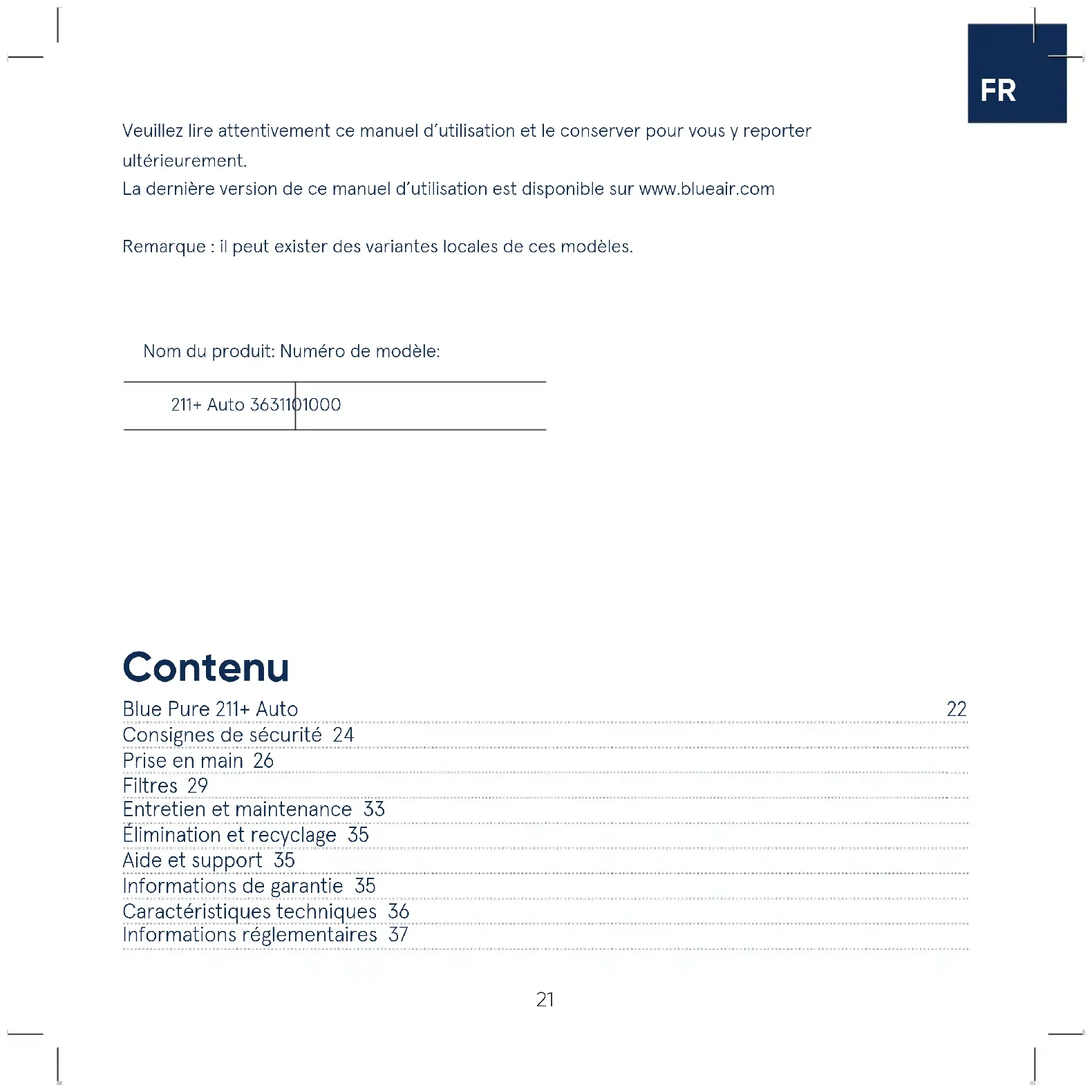 Veuillez lire attentivement ce manuel d’utilisation et le conserver pour vous y reporter ultérieurement. La dernière version de ce manuel d’utilisation est disponible sur www.blueair.com Remarque: il peut exister des variantes locales de ces modèles. Nom du produit: Numéro de modèle: 211+ Auto 3631101000 Blue Pure 211+ Auto 22 Consignes de sécurité 24 Prise en main 26 Filtres 29 Entretien et maintenance 33 Élimination et recyclage 35 Aide et support 35 Informations de garantie 35 Caractéristiques techniques 36 Informations réglementaires 37 Contenu22 Blue Pure 211+ Auto Blue Pure purificateur d’air est principalement composé d’un moteur, d’un ventilateur et d’un filtre. Le purificateur d’air élimine les contaminants de l’air dans une pièce pour améliorer la qualité de l’air intérieur. Vous pouvez modifier les paramètres du purificateur d’air à tout moment, à l’aide du panneau de commande du purificateur d’air. Recommandations pour des performances optimales