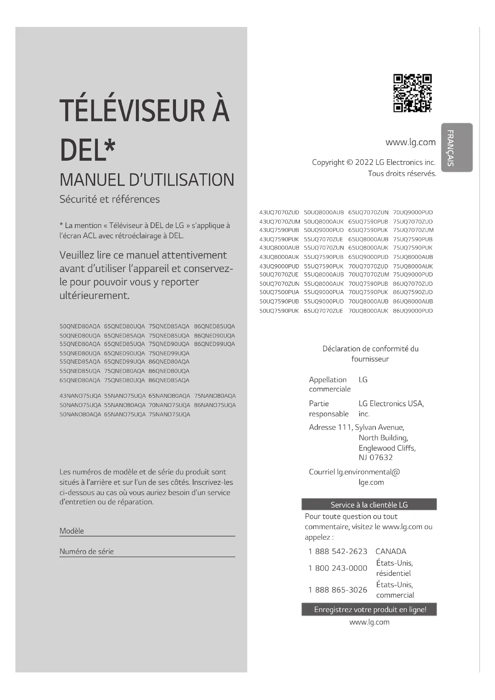 Partie responsable LG Electronics USA, inc. Adresse 111, Sylvan Avenue, North Building, Englewood Cliffs, NJ07632 Courriel lg.environmental@ lge.com Service à la clientèle LG Pour toute question ou tout commentaire, visitez le www.lg.com ou appelez : 1888542-2623 CANADA 1800243-0000 États-Unis, résidentiel 1888865-3026 États-Unis, commercial Enregistrez votre produit en ligne! www.lg.com2 Directives de sécurité importantes