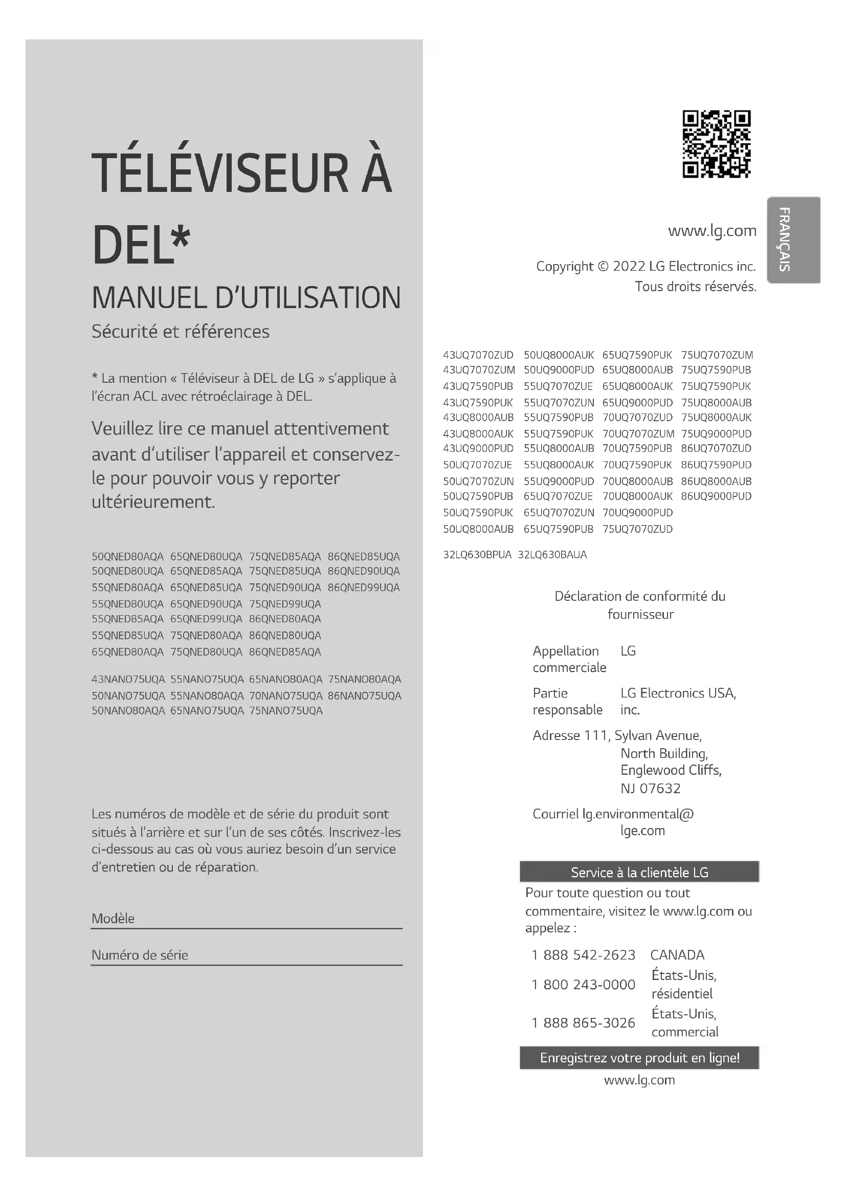 Partie responsable LG Electronics USA, inc. Adresse 111, Sylvan Avenue, North Building, Englewood Cliffs, NJ07632 Courriel lg.environmental@ lge.com Service à la clientèle LG Pour toute question ou tout commentaire, visitez le www.lg.com ou appelez : 1888542-2623 CANADA 1800243-0000 États-Unis, résidentiel 1888865-3026 États-Unis, commercial Enregistrez votre produit en ligne! www.lg.com2 Directives de sécurité importantes