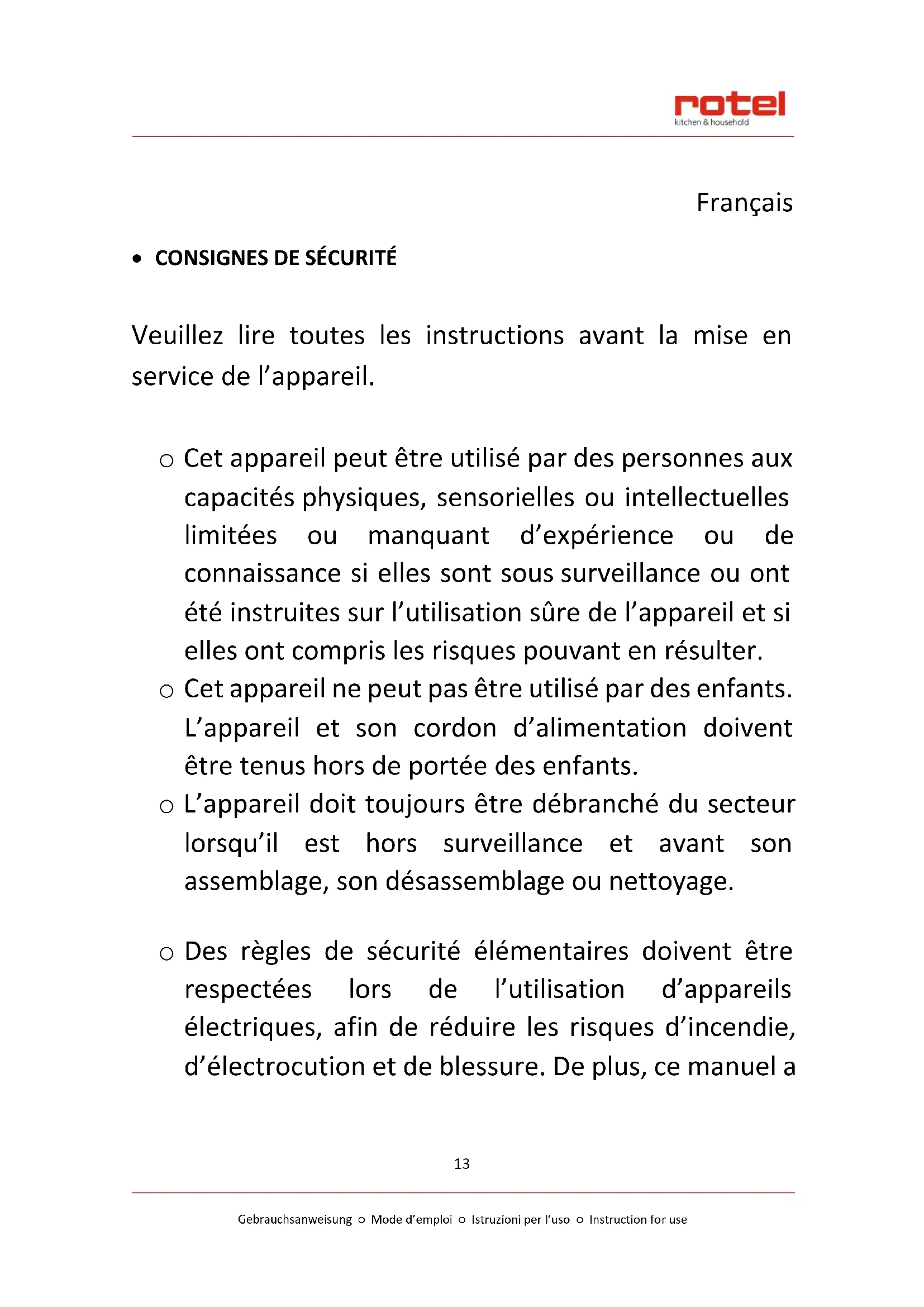 - ÉLIMINATION o Pour une élimination dans les règles de l’art, veuillez remettre l’appareil à un revendeur, un responsable du service après-vente ou Rotel SA. o Selon la directive européenne 2012/19/UE relative aux déchets d’équipements électriques et électroniques (DEEE), les appareils électroménagers ne doivent pas être éliminés avec les déchets solides urbains normaux. Les appareils hors d’usage doivent être collectés séparément pour optimiser le coût de réutilisation et de recyclage des matériaux contenus dans la machine tout en évitant les risques potentiels pour la santé publique et l’environnement. Le symbole de poubelle barrée figure sur tous les produits pour rappeler à leur propriétaire les obligations de tri sélectif des déchets. Pour de plus amples informations sur la mise au rebut correcte des appareils électroménagers, les consommateurs sont invités à contacter les autorités locales ou vendeurs d’électroménagers. Cet appareil est conforme aux directives européennes suivantes : 2014/35/UE (Équipement basse tension) 2014/30/UE (Compatibilité électromagnétique)Gebrauchsanweisung ○ Mode d’emploi ○ Istruzioni per l’uso ○ Instruction for use