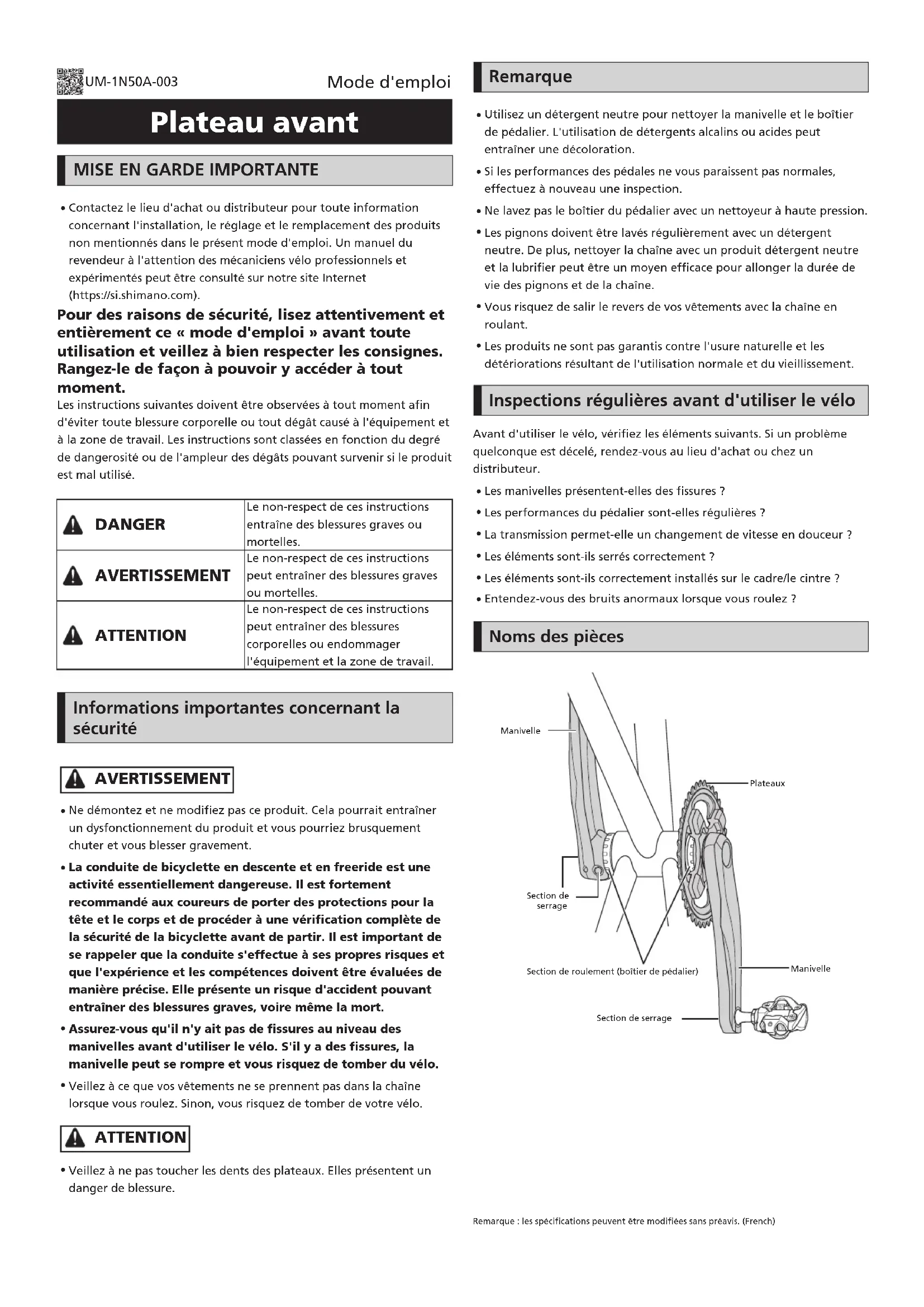 Entendez-vous des bruits anormaux lorsque vous roulez? Noms des pièces ManivellePlateauxSection de roulement (boîtier de pédalier)Section de serrageSection de serrageManivelleRemarque : les spécifications peuvent être modifiées sans préavis. (French) UM-1N50A-003 Mode d'emploi