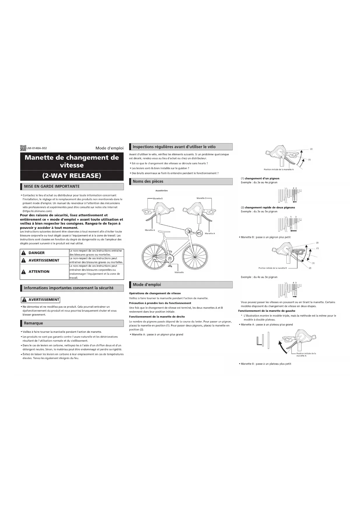 Manette B: passe à un plateau plus petit UM-0148A-002 Mode d'emploiPosition initiale de la manette B Vous pouvez passer les vitesses en poussant ou en tirant la manette. Correction (mécanisme supprimant les bruits)