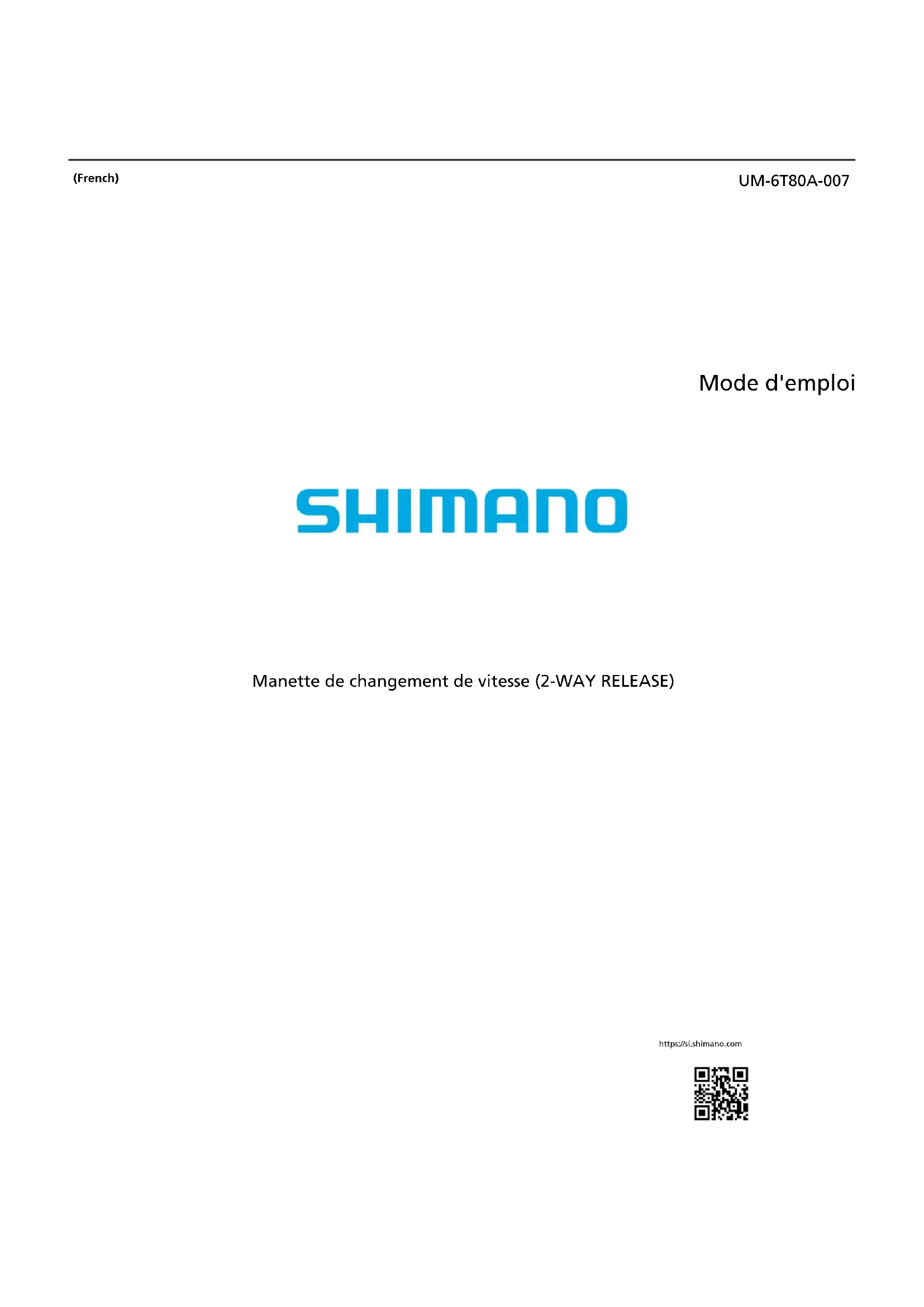 33Informations importantes concernant la sécurité Ne démontez et ne modifiez pas ce produit. Cela pourrait entraîner un dysfonctionnement du produit et vous pourriez brusquement chuter et vous blesser gravement. Informations importantes concernant la sécurité 44Remarque Veillez à faire tourner la manivelle lorsque le levier est actionné. Les produits ne sont pas garantis contre l'usure naturelle et les détériorations résultant de l'utilisation normale et du vieillissement. Afin de préserver au maximum les performances, nous recommandons fortement l'utilisation de lubrifiants et de produits d'entretien SHIMANO. Remarque 55Inspections régulières avant d'utiliser le vélo Avant d'utiliser le vélo, vérifiez les éléments suivants. Si un problème quelconque est décelé, contactez votre revendeur ou un distributeur. Est-ce que le changement de vitesse se déroule sans heurts ? Les leviers sont-ils bien installés sur le cintre ? Des bruits anormaux se font-ils entendre pendant le fonctionnement ? Avez-vous remarqué une usure anormale, un jeu excessif ou d'autres anomalies au niveau de la manette de la plaquette ? (Pour les modèles avec une plaquette reliée à la manette.) Inspections régulières avant d'utiliser le vélo 66Noms des pièces Manette B Manette C Manette RAPIDFIRE PLUS MONO Manette A Manette A Manette B Avant Arrière Manivelle Noms des pièces 77Mode d'emploi Fonctionnement du changement de vitesse Veillez à faire tourner la manivelle lorsque le levier est actionné. Précaution à prendre lors du fonctionnement Une fois que le changement de vitesse est terminé, les deux manettes A et B reviennent dans leur position initiale. Fonctionnement de la manette de droite Le nombre de pignons passés dépend de la course du levier. Pour passer un pignon, placez la manette en position (1). Pour passer deux pignons, placez la manette en position (2). de la manette A Position initiale (2) (1) (1) Changement d'un pignon Exemple : du 3e au 4e pignon (2) Changement rapide de deux pignons Exemple : du 3e au 5e pignon Manette A : passage d'un pignon plus petit vers un pignon plus grand Manette B : passage d'un pignon plus grand vers un pignon plus petit Mode d'emploi 88de la manette B Position initiale (2) (1) (1) (2) Vous pouvez passer les vitesses en poussant ou en tirant la manette. Certains modèles disposent du changement de vitesse en deux étapes. Exemple : du 4e au 3e pignon Fonctionnement de la manette de gauche Position initiale de la manette A Position initiale de la manette B Vous pouvez passer les vitesses en poussant ou en tirant la manette. Manette A : passage d'un plateau plus petit vers un plateau plus grand Manette B : passage d'un plateau plus grand vers un plateau plus petit Mode d'emploi 99Mode d'emploi (manette RAPIDFIRE PLUS MONO) Utilisez une seule manette. Fonctionnement du changement de vitesse Veillez à faire tourner la manivelle lorsque le levier est actionné. Fonctionnement de la manette RAPIDFIRE PLUS MONO Manette C