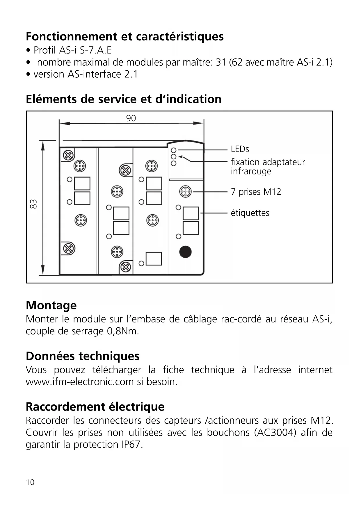 - version AS-interface 2.1 Eléments de service et d’indication Montage Monter le module sur l’embase de câblage rac-cordé au réseau AS-i, couple de serrage 0,8Nm. Données techniques Vous pouvez télécharger la fiche technique à l'adresse internet www.ifm-electronic.com si besoin. Raccordement électrique Raccorder les connecteurs des capteurs /actionneurs aux prises M12. Couvrir les prises non utilisées avec les bouchons (AC3004) afin de garantir la protection IP67.