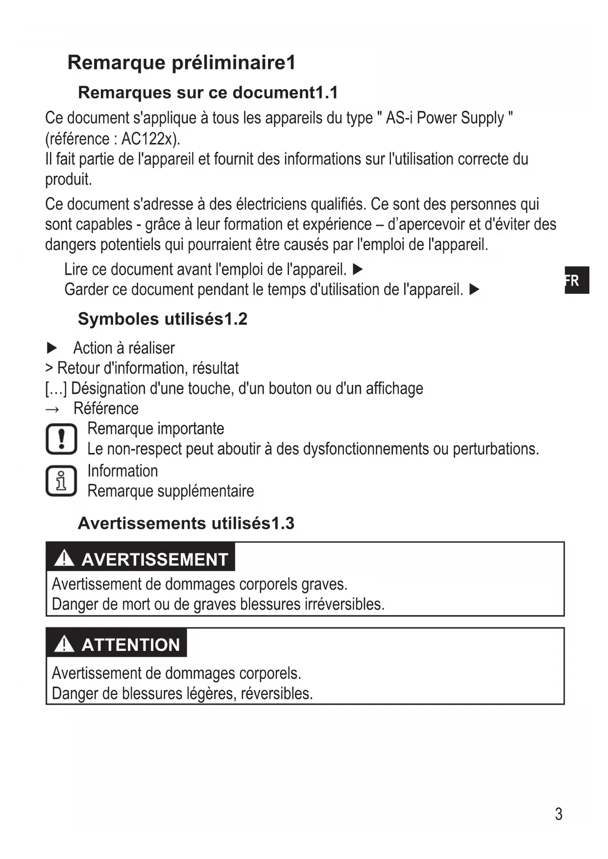 Remarque préliminaire1 Remarques sur ce document1.1 Ce document s'applique à tous les appareils du type " AS-i Power Supply " (référence : AC122x) Il fait partie de l'appareil et fournit des informations sur l'utilisation correcte du produit Ce document s'adresse à des électriciens qualifiés Ce sont des personnes qui sont capables - grâce à leur formation et expérience – d’apercevoir et d'éviter des dangers potentiels qui pourraient être causés par l'emploi de l'appareil Lire ce document avant l'emploi de l'appareil ► Garder ce document pendant le temps d'utilisation de l'appareil ► Symboles utilisés1.2 ► Action à réaliser > Retour d'information, résultat […] Désignation d'une touche, d'un bouton ou d'un affichage