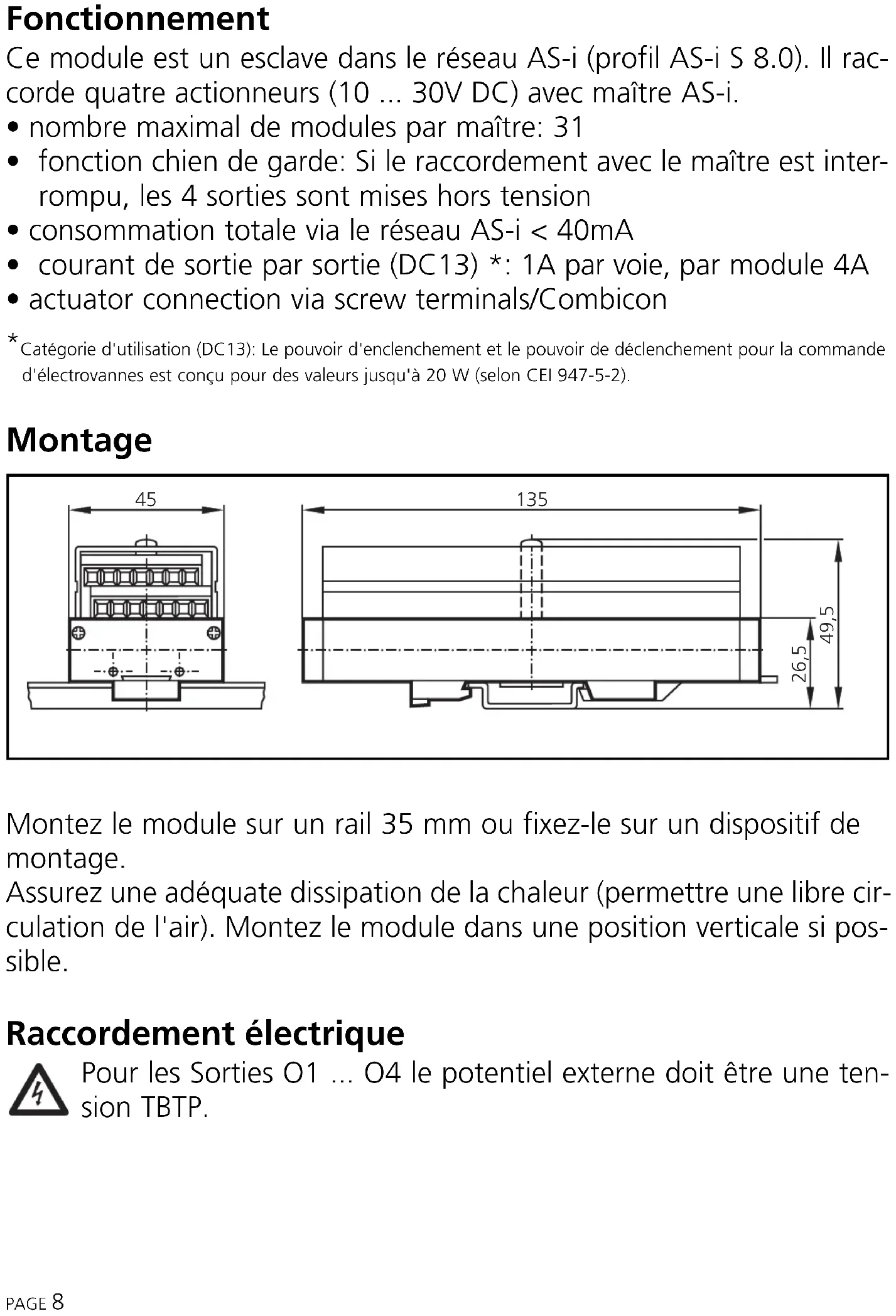 Catégorie d'utilisation (DC13): Le pouvoir d'enclenchement et le pouvoir de déclenchement pour la commande d'électrovannes est conçu pour des valeurs jusqu'à 20 W (selon CEI 947-5-2). Montage Montez le module sur un rail 35 mm ou fixez-le sur un dispositif de montage. Assurez une adéquate dissipation de la chaleur (permettre une libre cir- culation de l'air). Montez le module dans une position verticale si pos- sible. Raccordement électrique Pour les Sorties O1 ... O4 le potentiel externe doit être une ten- sion TBTP. PAGE 8