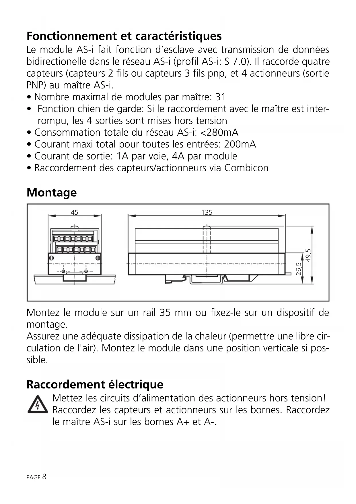 - Raccordement des capteurs/actionneurs via Combicon Montage Montez le module sur un rail 35 mm ou fixez-le sur un dispositif de montage. Assurez une adéquate dissipation de la chaleur (permettre une libre cir- culation de l'air). Montez le module dans une position verticale si pos- sible. Raccordement électrique Mettez les circuits d’alimentation des actionneurs hors tension! Raccordez les capteurs et actionneurs sur les bornes. Raccordez le maître AS-i sur les bornes A+ et A-. PAGE 8