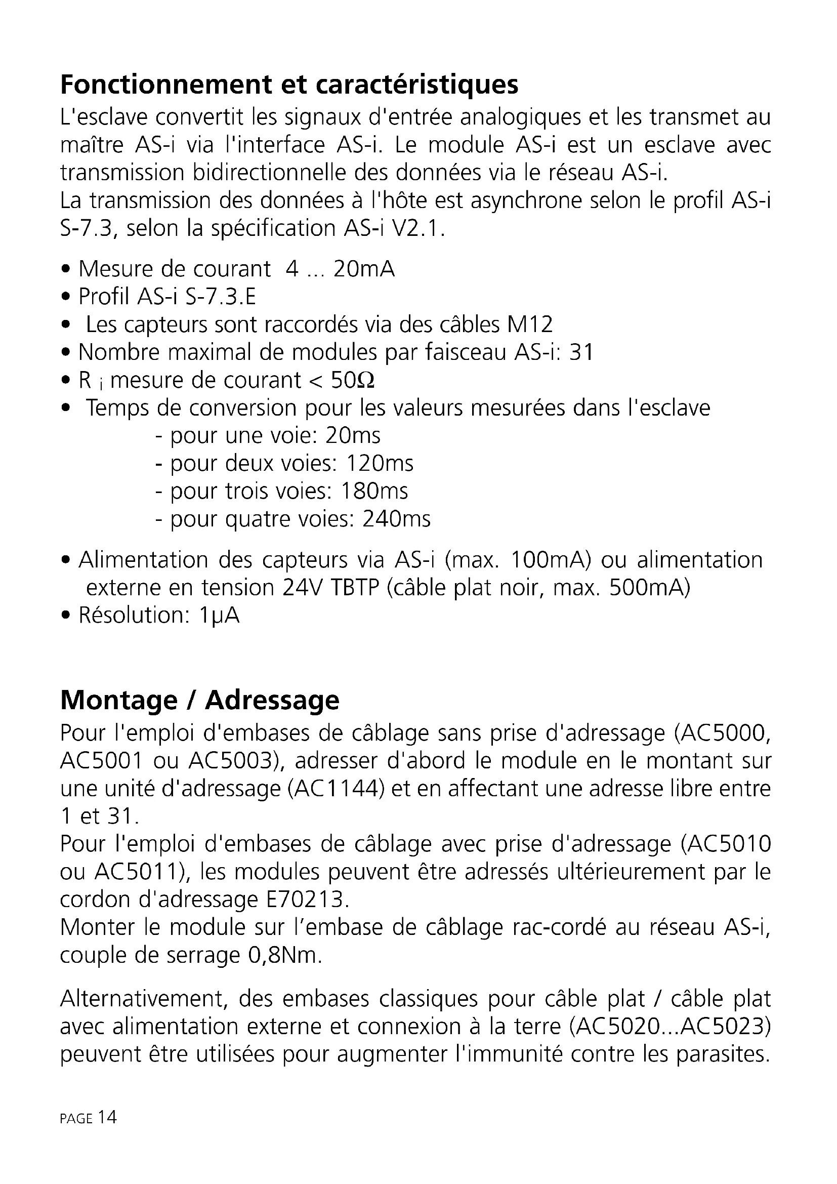 - Résolution: 1µA Montage / Adressage Pour l'emploi d'embases de câblage sans prise d'adressage (AC5000, AC5001 ou AC5003), adresser d'abord le module en le montant sur une unité d'adressage (AC1144) et en affectant une adresse libre entre 1 et 31. Pour l'emploi d'embases de câblage avec prise d'adressage (AC5010 ou AC5011), les modules peuvent être adressés ultérieurement par le cordon d'adressage E70213. Monter le module sur l’embase de câblage rac-cordé au réseau AS-i, couple de serrage 0,8Nm. Alternativement, des embases classiques pour câble plat / câble plat avec alimentation externe et connexion à la terre (AC5020...AC5023) peuvent être utilisées pour augmenter l'immunité contre les parasites. PAGE 14Raccordement électrique Le module analogique est raccordé à l'interface AS-i via l'interface EMS standardisée (alimentation via AS-i) ou via l'interface E-EMS (alimenta- tion en tension externe 24V TBTP). Pour une alimentation externe en 24V une embase de câblage pour câble plat avec alimentation externe (AC5003 ou AC5011 ) doit être sélectionnée. En cas d'un total de plus de 100mA pour l'alimentation de tous les capteurs, une alimentation externe en 24V TBTP est néces- saire. L'alimentation est automatiquement changée quand la tension externe 24V est appliquée. PAGE 15