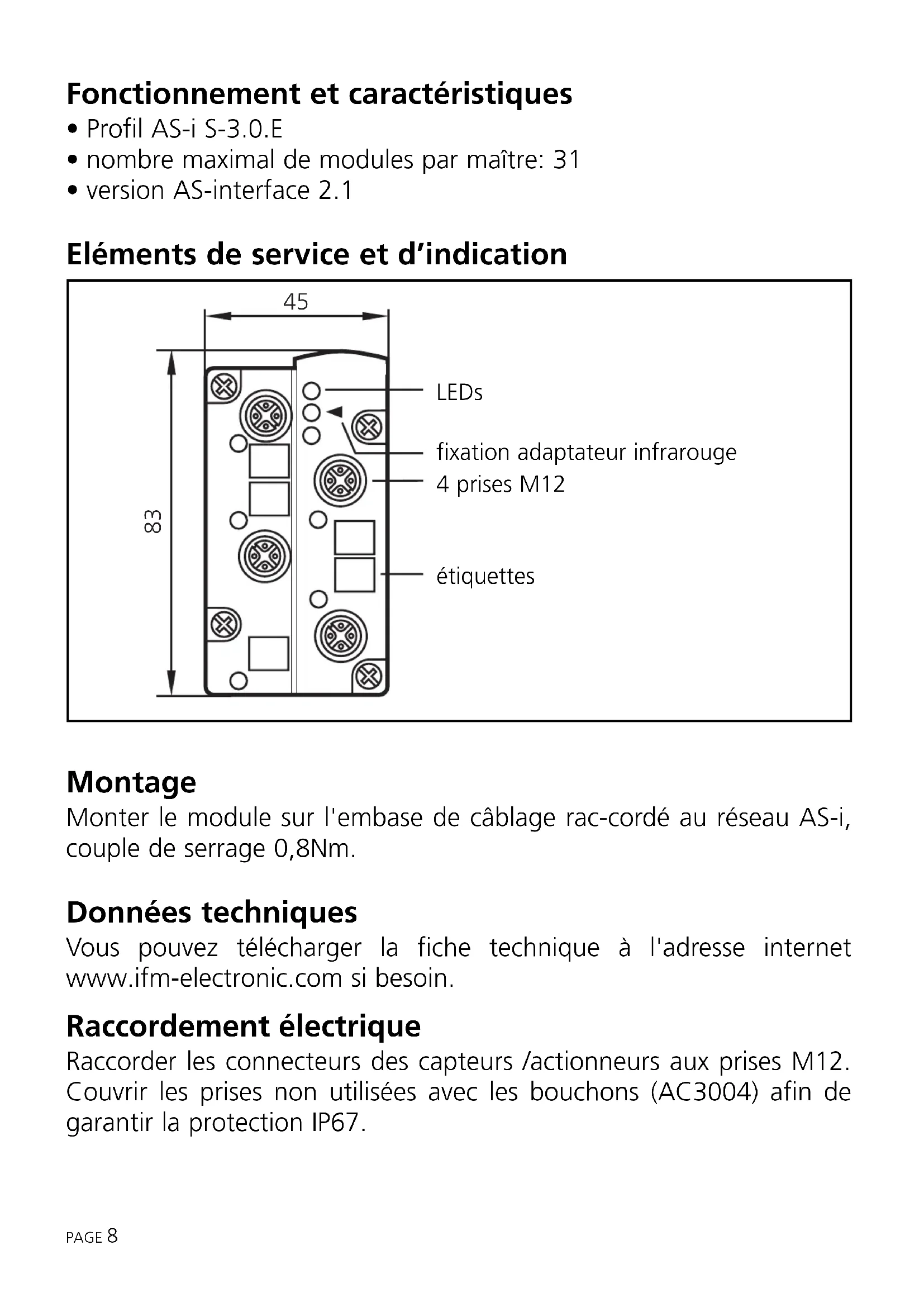 - version AS-interface 2.1 Eléments de service et d’indication Montage Monter le module sur l'embase de câblage rac-cordé au réseau AS-i, couple de serrage 0,8Nm. Données techniques Vous pouvez télécharger la fiche technique à l'adresse internet www.ifm-electronic.com si besoin. Raccordement électrique Raccorder les connecteurs des capteurs /actionneurs aux prises M12. Couvrir les prises non utilisées avec les bouchons (AC3004) afin de garantir la protection IP67. PAGE 8