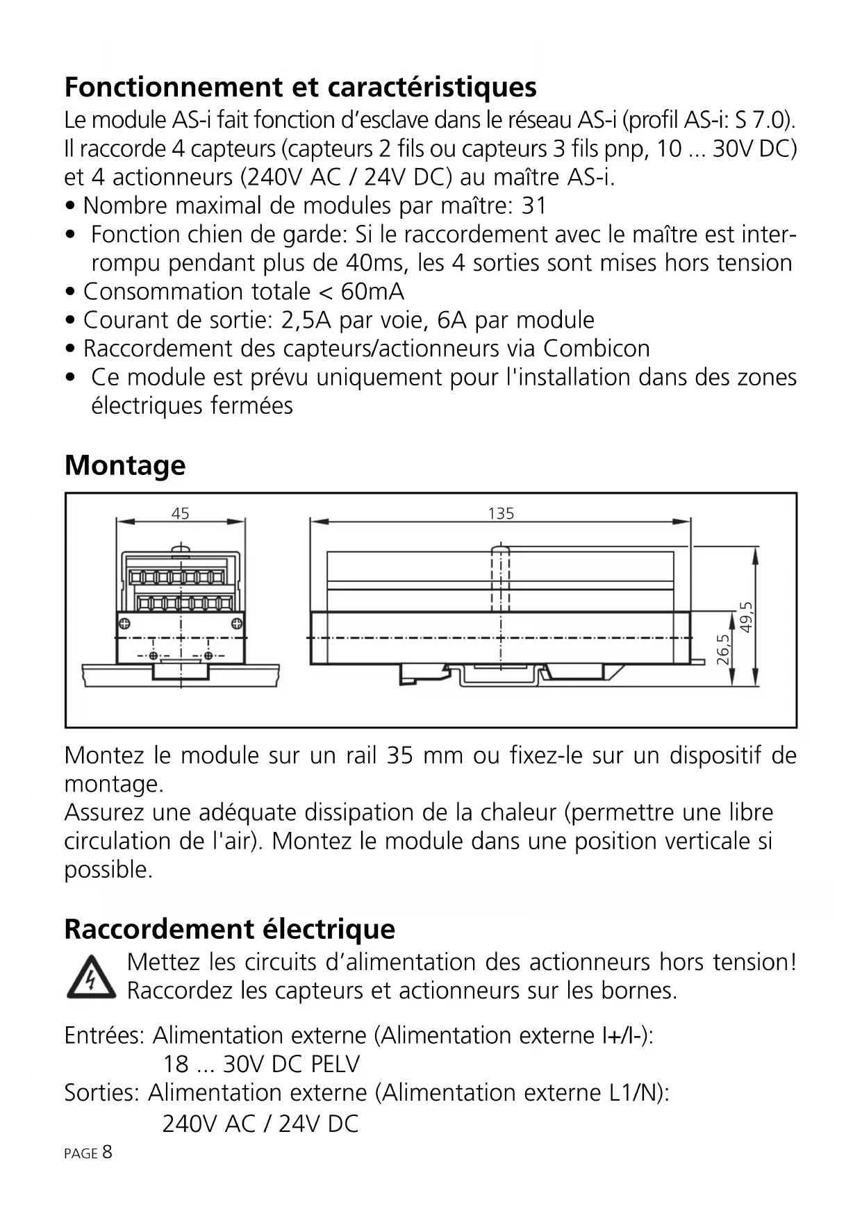 - LED yellow: input/output is switched PAGE 7Fonctionnement et caractéristiques Le module AS-i fait fonction d’esclave dans le réseau AS-i (profil AS-i: S 7.0). Il raccorde 4 capteurs (capteurs 2 fils ou capteurs 3 fils pnp, 10 ... 30V DC) et 4 actionneurs (240V AC / 24V DC) au maître AS-i.