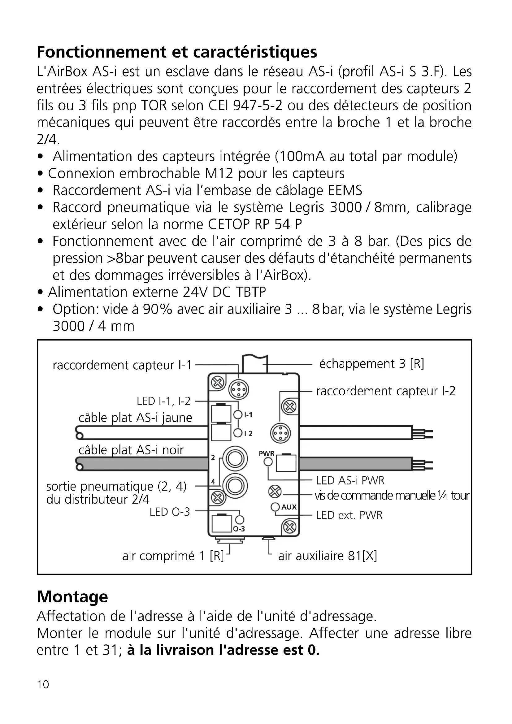 AirBox at www.ifm-electronic.com. Enter the article number of your AirBox on the start page under "Data sheet direct". You receive the additional product information by clicking on "Additional data". 9Fonctionnement et caractéristiques L'AirBox AS-i est un esclave dans le réseau AS-i (profil AS-i S 3.F). Les entrées électriques sont conçues pour le raccordement des capteurs 2 fils ou 3 fils pnp TOR selon CEI 947-5-2 ou des détecteurs de position mécaniques qui peuvent être raccordés entre la broche 1 et la broche 2/4.