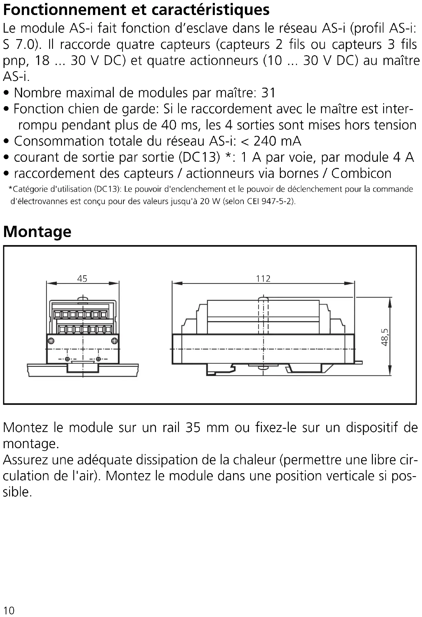 - raccordement des capteurs / actionneurs via bornes / Combicon *Catégorie d'utilisation (DC13): Le pouvoir d'enclenchement et le pouvoir de déclenchement pour la commande d'électrovannes est conçu pour des valeurs jusqu'à 20 W (selon CEI 947-5-2). Montage Montez le module sur un rail 35 mm ou fixez-le sur un dispositif de montage. Assurez une adéquate dissipation de la chaleur (permettre une libre cir- culation de l'air). Montez le module dans une position verticale si pos- sible.