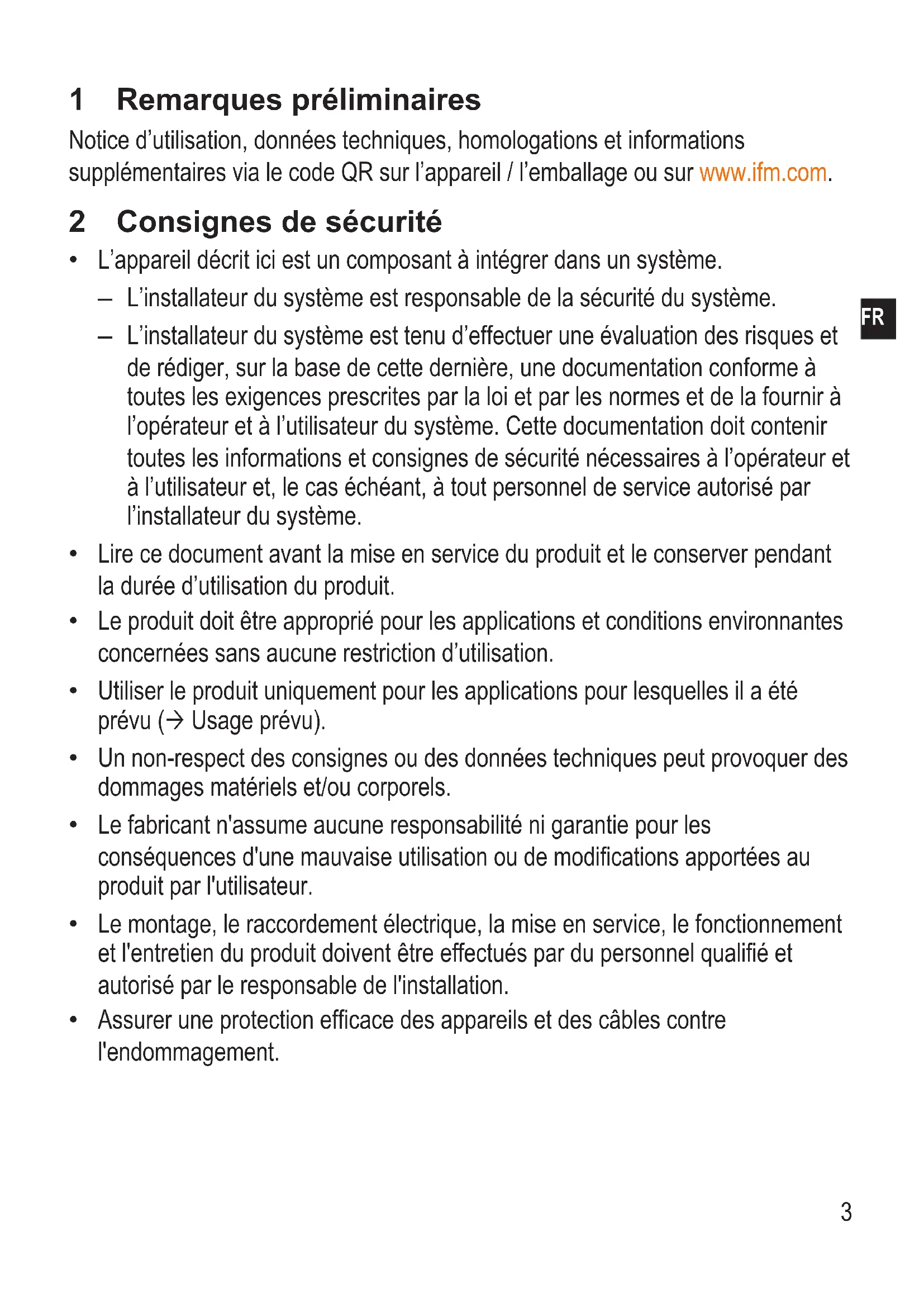 5 Raccordement électrique ............................................................................... 7 6 Eléments de service et de visualisation ......................................................... 8 7 Maintenance, réparation et élimination .......................................................... 93 1 Remarques préliminaires Notice d’utilisation, données techniques, homologations et informations supplémentaires via le code QR sur l’appareil / l’emballage ou sur www.ifm.com. 2 Consignes de sécurité