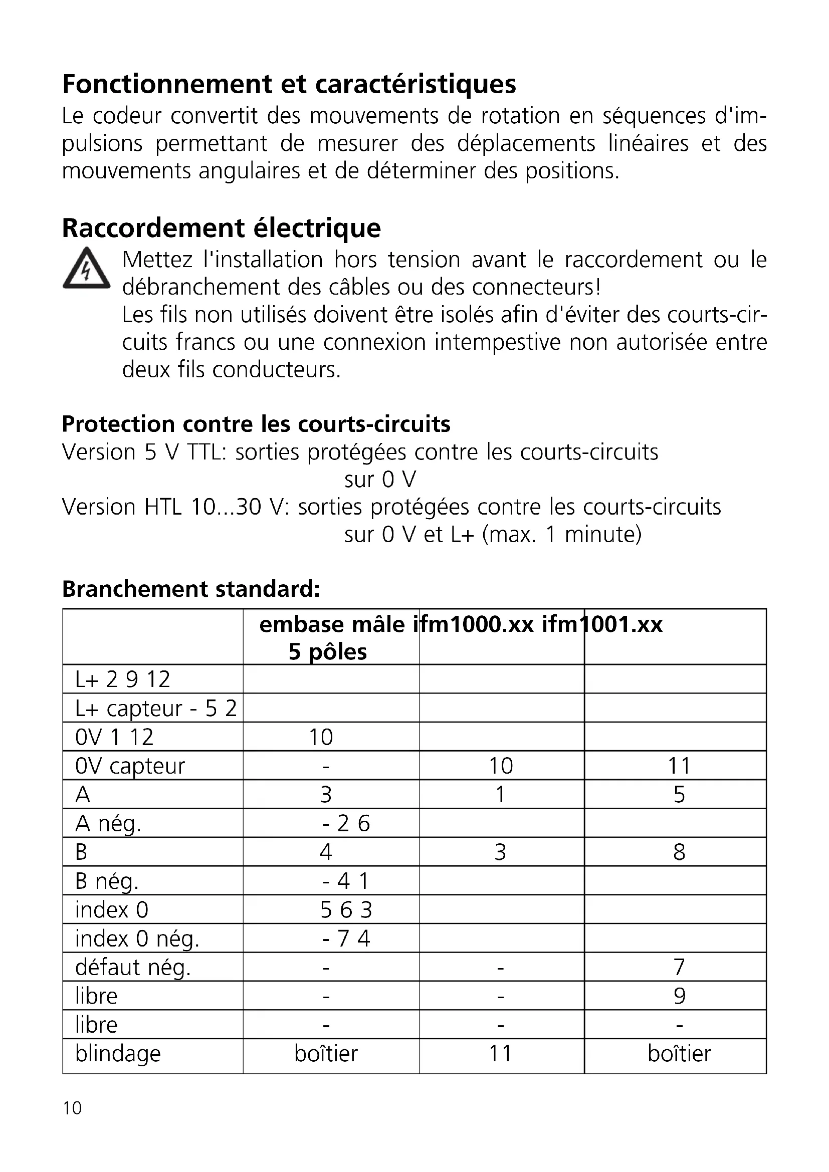 embase mâle ifm1000.xx ifm1001.xx 5 pôles L+ 2 9 12 L+ capteur - 5 2 0V 1 12 10 0V capteur - 10 11 A315 A nég. - 2 6 B438 B nég. - 4 1 index 0 5 6 3 index 0 nég. - 7 4 défaut nég. - - 7 libre - - 9 libre - - - blindage boîtier 11 boîtierVous trouvez également le branchement sur le capot du boîtier. S'il existe un raccordement spécial, le codeur doit être branché comme indiqué sur l'étiquette du boîtier. Les fils L+ (capteur) et 0 V (capteur) sont reliés en interne à la tension d'alimentation. Lorsque des modules électroniques régulant la tension d'alimentation sont utilisés, ces fils peuvent servir de fils de test. En cas de non-utilisation ces fils doivent être reliés à la tension d'alimentation ou être isolés. En fonction de la version, le raccordement électrique se fait par le câble ou par des câbles à se procurer séparément. Lorsque des câbles appropriés sont utilisés, la longueur maximale du câble est de 100 m pour la version 5 V TTL et de 300 m pour la ver- sion 10...30 V HTL.