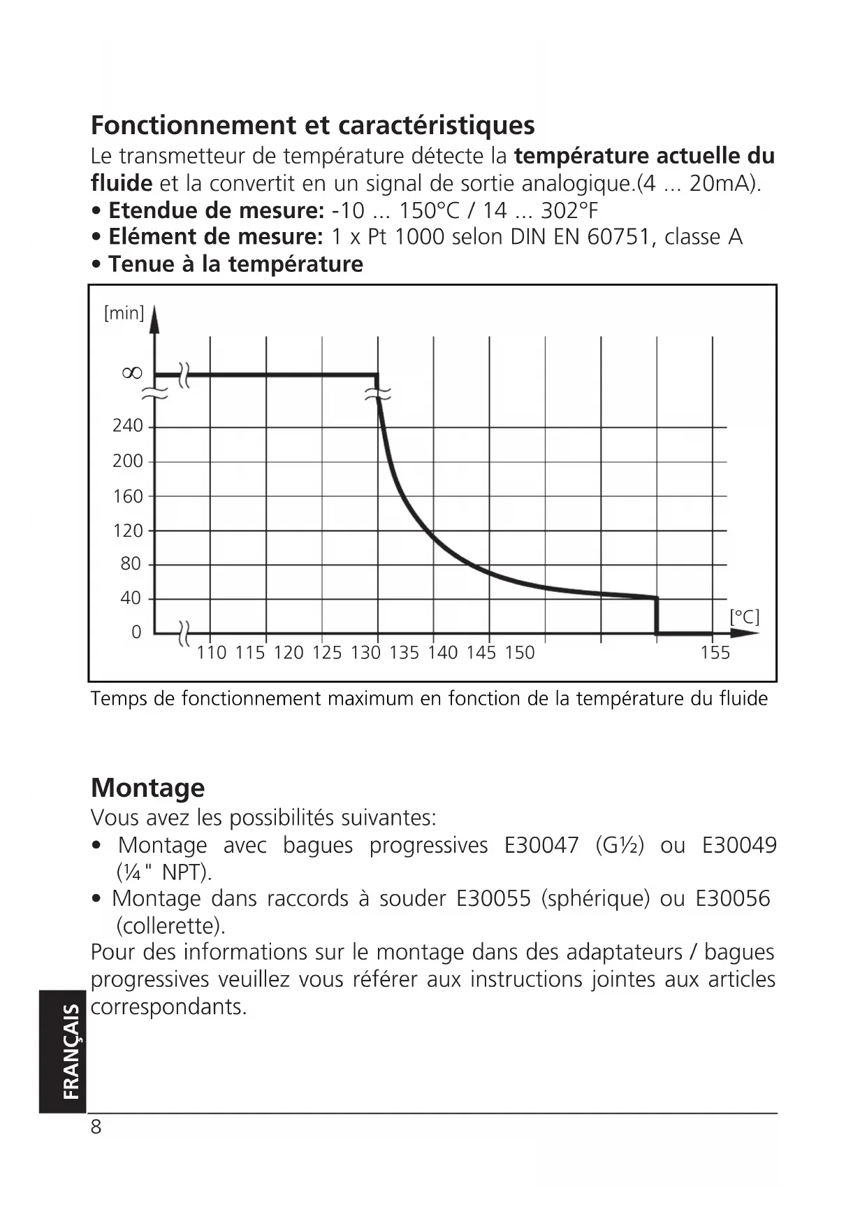 only applies to the sensor; for installation in adapters the indications in the adapter data sheet shall applyFonctionnement et caractéristiques Le transmetteur de température détecte la température actuelle du fluide et la convertit en un signal de sortie analogique.(4 ... 20mA).