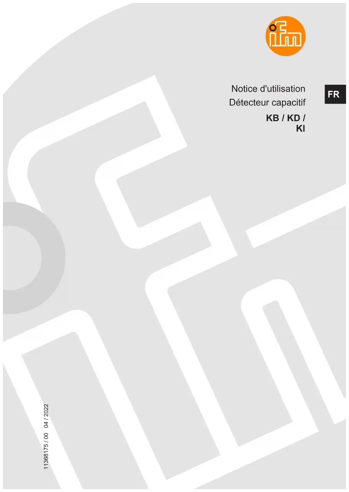 1 Remarques préliminaires Notice d’utilisation, données techniques, homologations, accessoires et informations supplémentaires via le code QR sur l’appareil / l’emballage ou sur www.ifm.com. 1.1 Symboles utilisés Condition préalable Action à effectuer Réaction, résultat [...] Désignation d'une touche, d'un bouton ou d'un affichage Référence Remarque importante Le non-respect peut aboutir à des dysfonctionnements ou perturbations Information Remarque supplémentaireKB / KD / KI Détecteur capacitif