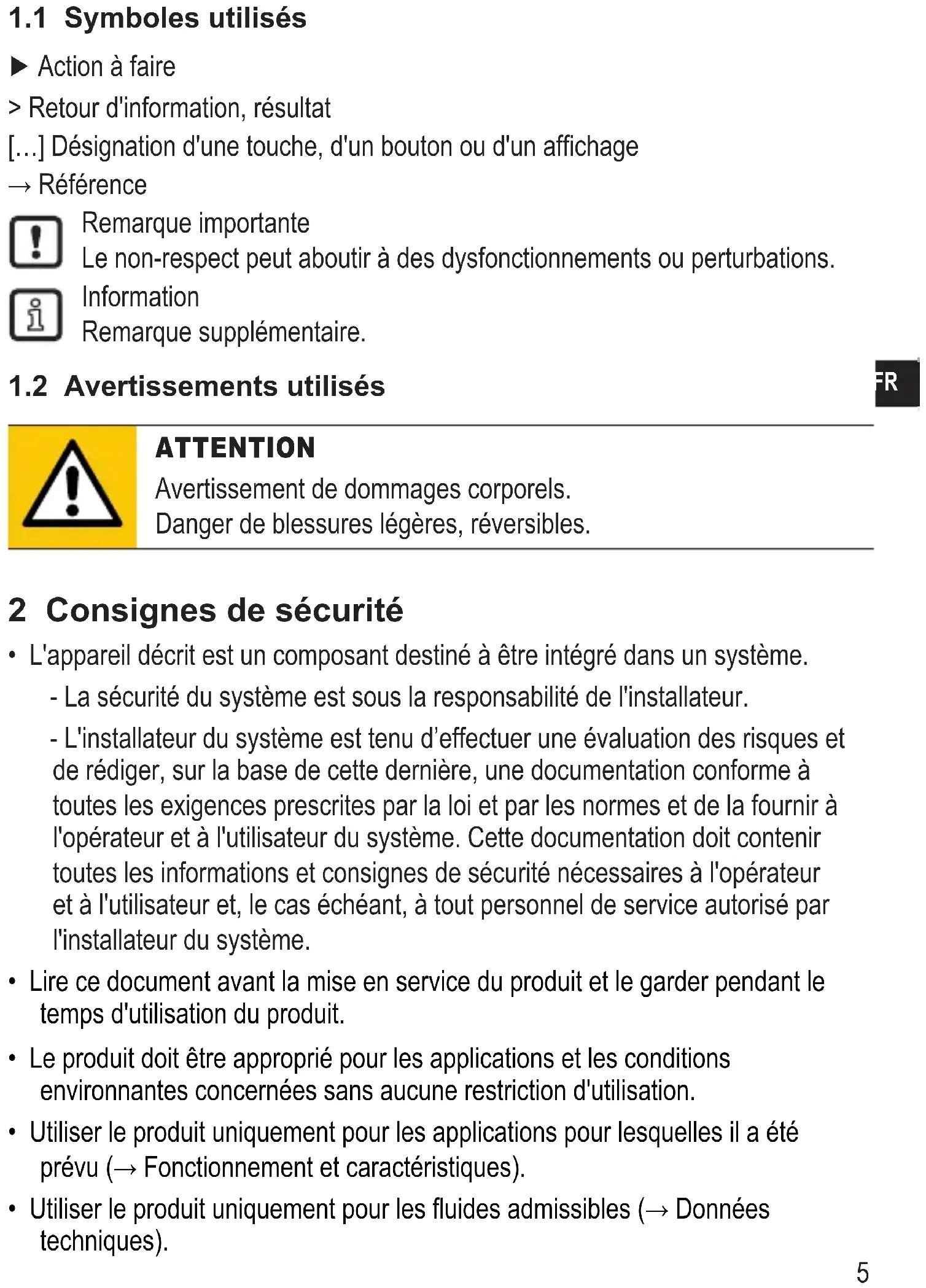 - L'appareil décrit est un composant destiné à être intégré dans un système - La sécurité du système est sous la responsabilité de l'installateur - L'installateur du système est tenu d’effectuer une évaluation des risques et de rédiger, sur la base de cette dernière, une documentation conforme à toutes les exigences prescrites par la loi et par les normes et de la fournir à l'opérateur et à l'utilisateur du système Cette documentation doit contenir toutes les informations et consignes de sécurité nécessaires à l'opérateur et à l'utilisateur et, le cas échéant, à tout personnel de service autorisé par l'installateur du système
