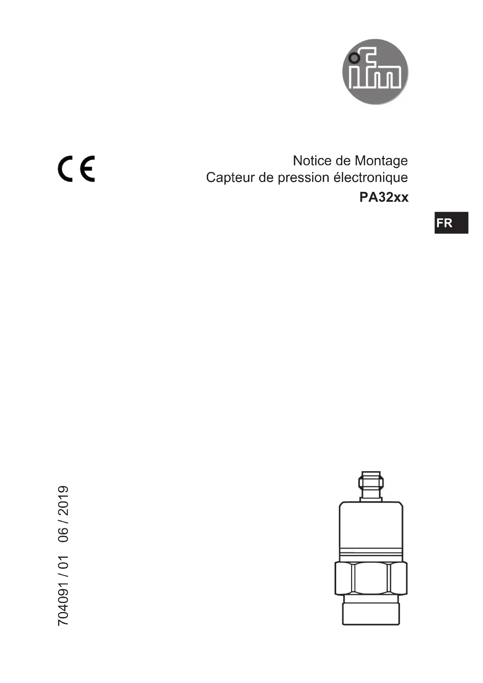 Notice de Montage Capteur de pression électronique PA32xx 704091 / 01 06 / 2019 FR2 1 Symboles utilisés ► Action à réaliser Remarque importante Le non-respect peut aboutir à des dysfonctionnements ou perturbations. Information Remarque supplémentaire. Contenu 1 Symboles utilisés .................................................................................................2 2 Consignes de sécurité .........................................................................................3 3 Fonctionnement et caractéristiques .....................................................................4