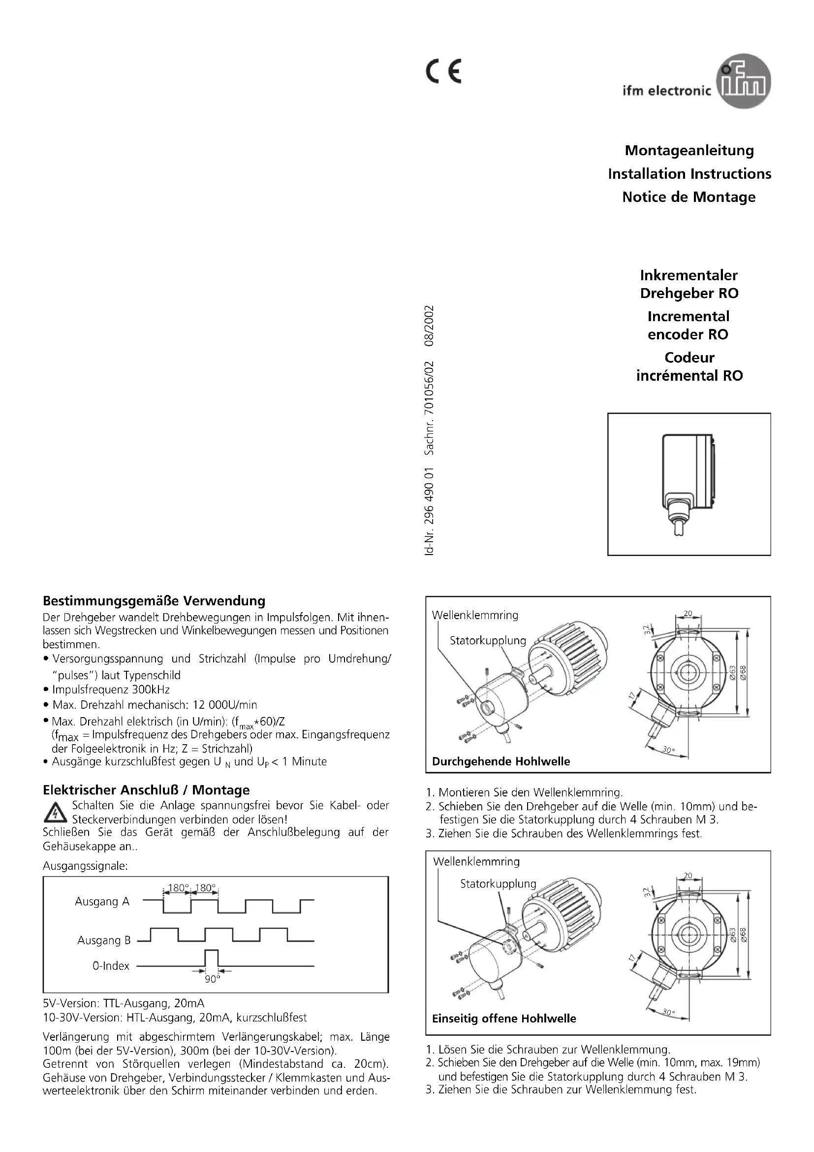 pendant < 1mn Raccordement électrique / Montage Mettre l'installation hors tension avant le raccordement ou le débranchement du câble ou connecteur! Raccorder l'appareil selon le branchement indiqué sur le boîtier. Signaux de sortie: Version 5V: sortie TTL, 20mA Version 10-30V: sortie HTL, 20mA, protégée contre les courts-circuits Extension par câble blindé; longueur maximale 100m (version 5V), 300m (version 10-30V); installer séparément des sources parasites (distance minimale env. 20cm). Relier le boîtier du codeur, le connec- teur / le bornier et l’électronique d’exploitation via le blindage et relier à la terre. 1.Mettre l’écrou de serrage sur le codeur. 2.Introduire le codeur dans l’arbre (10mm au minimum) et fixer l’accouplement stator à l’aide de quatre vis M3. 3.Visser l’écrou de serrage. 1.Mettre les écrous de serrage sur le codeur. 2.Introduire l’arbre dans le codeur (10mm au minimum) et fixer l’accouplement stator à l’aide de quatre vis M3. 3.Visser les écrous de serrage. 1.Place the clamping nut on the encoder. 2.Slip the encoder onto the shaft (min. 10mm) and fix the stator cou- pling by means of four M3 screws. 3.Tighten the screws of the clamping nut. 1.Place the clamping nut on the encoder. 2.Slip the encoder onto the shaft (min. 10mm) and fix the stator coupling by means of four M3 screws. 3.Tighten the screws of the clamping nut. 180° 180° 90° output A output B index 0 180° 180° 90° sortie A sortie B index 0