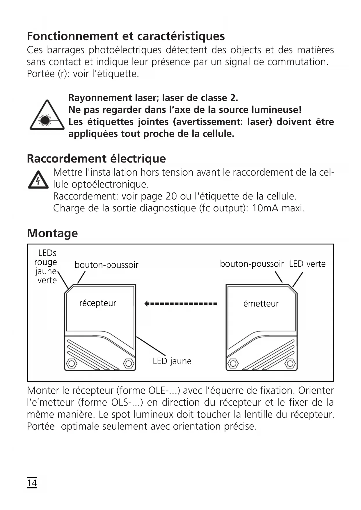 - Immediately switches in the case of an internal fault, it is only switched back by turning off the operating voltage and then on again. Maintenance Keep the plastic lenses of the sensor free from soiling. For cleaning do not use any solvents or cleaning agents which could damage the plastic lenses. 13Fonctionnement et caractéristiques Ces barrages photoélectriques détectent des objects et des matières sans contact et indique leur présence par un signal de commutation. Portée (r): voir l'étiquette. Rayonnement laser; laser de classe 2. Ne pas regarder dans l’axe de la source lumineuse! Les étiquettes jointes (avertissement: laser) doivent être appliquées tout proche de la cellule. Raccordement électrique Mettre l'installation hors tension avant le raccordement de la cel- lule optoélectronique. Raccordement: voir page 20 ou l'étiquette de la cellule. Charge de la sortie diagnostique (fc output): 10mA maxi. Montage Monter le récepteur (forme OLE-...) avec l’équerre de fixation. Orienter l’e´metteur (forme OLS-...) en direction du récepteur et le fixer de la même manière. Le spot lumineux doit toucher la lentille du récepteur. Portée optimale seulement avec orientation précise.