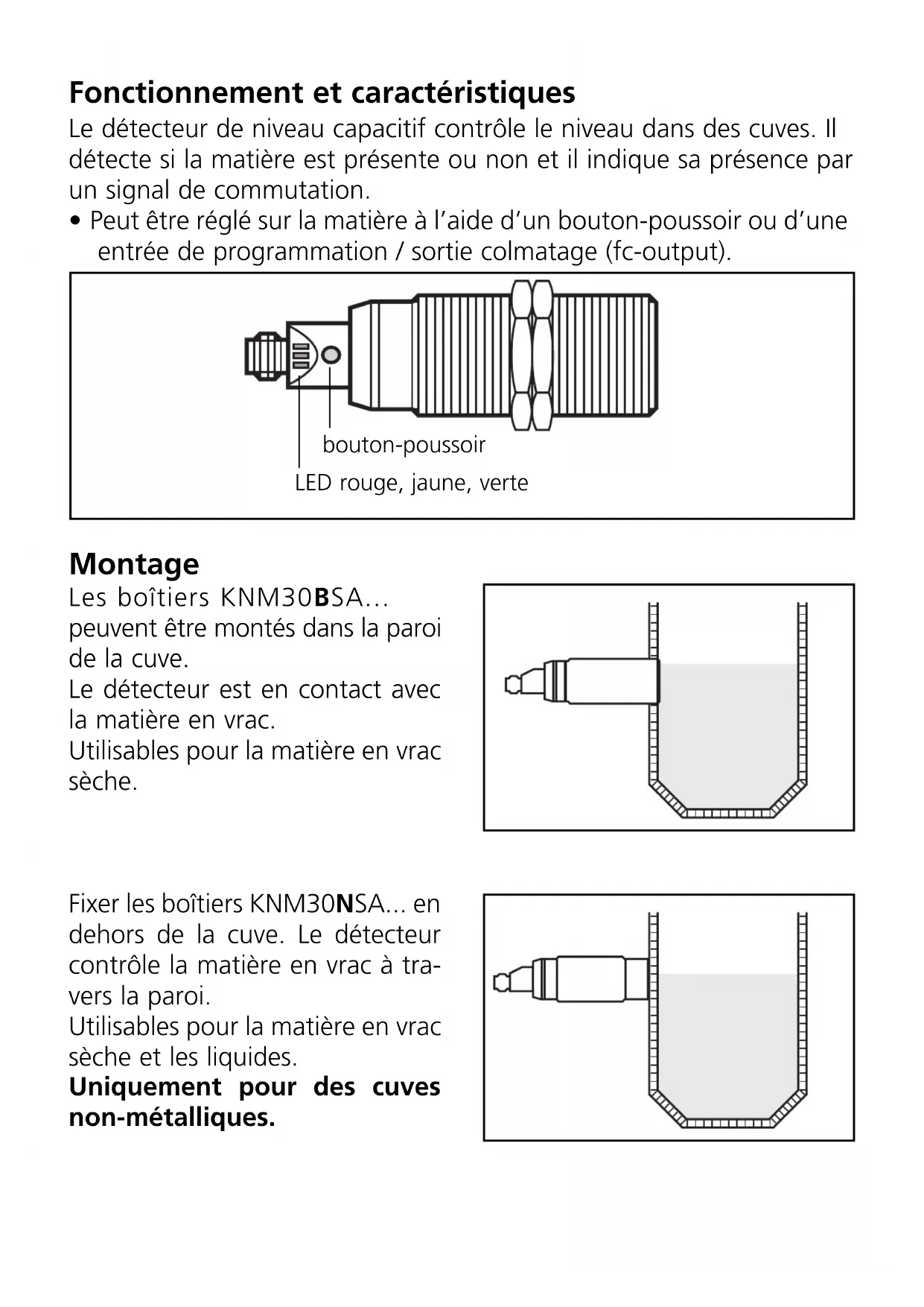 - Peut être réglé sur la matière à l’aide d’un bouton-poussoir ou d’une entrée de programmation / sortie colmatage (fc-output). Montage bouton-poussoir LED rouge, jaune, verte Les boîtiers KNM30BSA... peuvent être montés dans la paroi de la cuve. Le détecteur est en contact avec la matière en vrac. Utilisables pour la matière en vrac sèche. Fixer les boîtiers KNM30NSA... en dehors de la cuve. Le détecteur contrôle la matière en vrac à tra- vers la paroi. Utilisables pour la matière en vrac sèche et les liquides. Uniquement pour des cuves non-métalliques.Raccordement électrique Mettre l’installation hors tension avant le raccordement. Raccor- dement selon les indications de l’étiquette. Réglage
