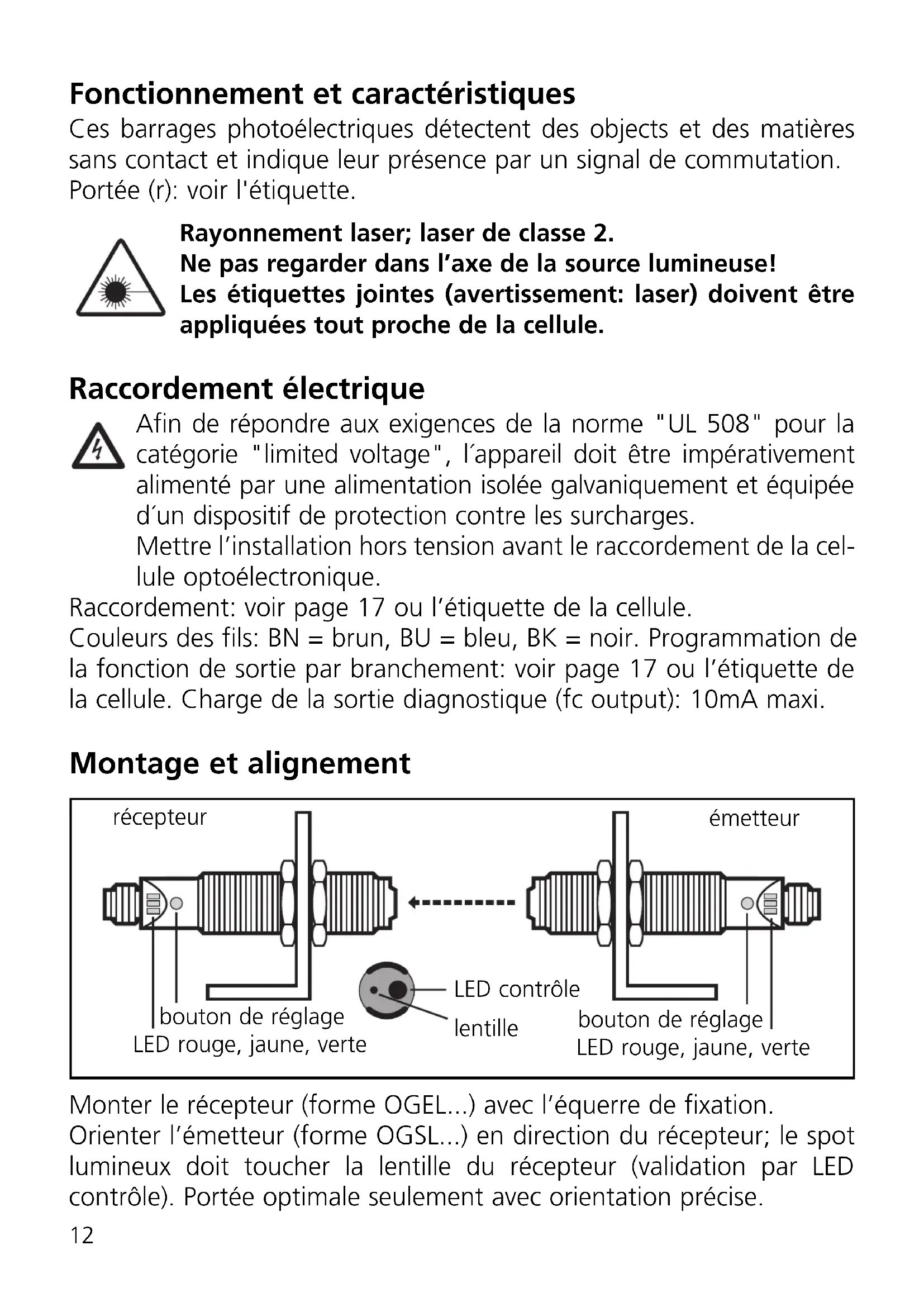 receiverFonctionnement et caractéristiques Ces barrages photoélectriques détectent des objects et des matières sans contact et indique leur présence par un signal de commutation. Portée (r): voir l'étiquette. Rayonnement laser; laser de classe 2. Ne pas regarder dans l’axe de la source lumineuse! Les étiquettes jointes (avertissement: laser) doivent être appliquées tout proche de la cellule. Raccordement électrique Afin de répondre aux exigences de la norme "UL 508" pour la catégorie "limited voltage", l´appareil doit être impérativement alimenté par une alimentation isolée galvaniquement et équipée d´un dispositif de protection contre les surcharges. Mettre l’installation hors tension avant le raccordement de la cel- lule optoélectronique. Raccordement: voir page 17 ou l’étiquette de la cellule. Couleurs des fils: BN = brun, BU = bleu, BK = noir. Programmation de la fonction de sortie par branchement: voir page 17 ou l’étiquette de la cellule. Charge de la sortie diagnostique (fc output): 10mA maxi. Montage et alignement Monter le récepteur (forme OGEL...) avec l’équerre de fixation. Orienter l’émetteur (forme OGSL...) en direction du récepteur; le spot lumineux doit toucher la lentille du récepteur (validation par LED contrôle). Portée optimale seulement avec orientation précise. LED rouge, jaune, verte bouton de réglage