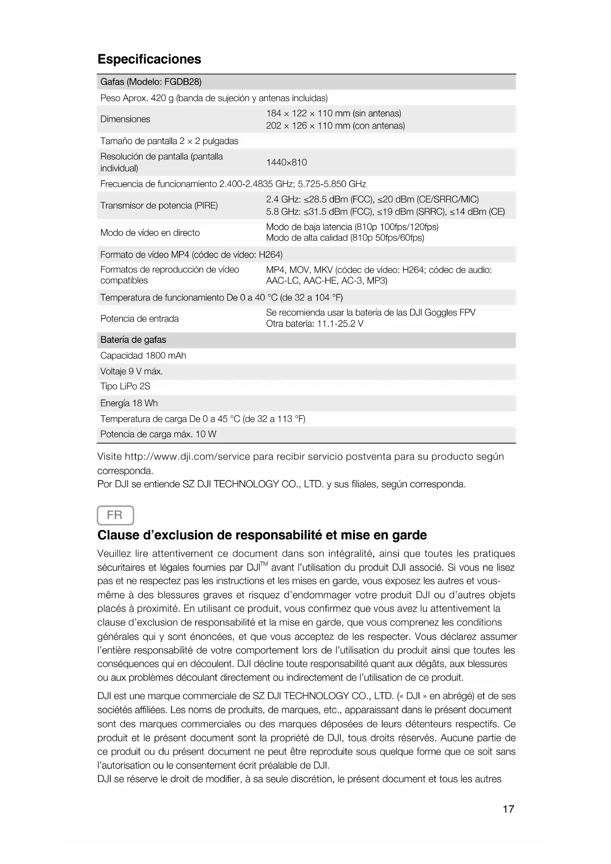 avant l’utilisation du produit DJI associé. Si vous ne lisez pas et ne respectez pas les instructions et les mises en garde, vous exposez les autres et vous- même à des blessures graves et risquez d’endommager votre produit DJI ou d’autres objets placés à proximité. En utilisant ce produit, vous confirmez que vous avez lu attentivement la clause d’exclusion de responsabilité et la mise en garde, que vous comprenez les conditions générales qui y sont énoncées, et que vous acceptez de les respecter. Vous déclarez assumer l’entière responsabilité de votre comportement lors de l’utilisation du produit ainsi que toutes les conséquences qui en découlent. DJI décline toute responsabilité quant aux dégâts, aux blessures ou aux problèmes découlant directement ou indirectement de l’utilisation de ce produit. DJI est une marque commerciale de SZ DJI TECHNOLOGY CO., LTD. (« DJI » en abrégé) et de ses sociétés aliées. Les noms de produits, de marques, etc., apparaissant dans le présent document sont des marques commerciales ou des marques déposées de leurs détenteurs respectifs. Ce produit et le présent document sont la propriété de DJI, tous droits réservés. Aucune partie de ce produit ou du présent document ne peut être reproduite sous quelque forme que ce soit sans l’autorisation ou le consentement écrit préalable de DJI. DJI se réserve le droit de modier, à sa seule discrétion, le présent document et tous les autres18 documents connexes. Pour connaître les dernières informations sur le produit, rendez-vous sur le site http://www.dji.com et cliquez sur la page produit. Cette clause de non-responsabilité est disponible en plusieurs langues. En cas de divergence entre les diérentes versions, la version en langue anglaise prévaudra. Utilisation Rendez-vous sur : http://www.dji.com/fpv (guide d’utilisateur) pour en savoir plus sur l’utilisation de l’Unité Aérienne DJI FPV. Rendez-vous sur : http://www.dji.com/dji-fpv (guide d’utilisateur) pour en savoir plus sur l’utilisation de ce produit avec le drone DJI FPV. Caractéristiques techniques Casque (Modèle : FGDB28) Poids Env. 420 g (bandeau et antennes incluses) Dimensions 184 × 122 × 110 mm (sans antennes) 202 × 126 × 110 mm (avec antennes) Taille de l'écran 2 pouces × 2 Résolution de l'écran (écran unique) 1 440 × 810 Fréquence de fonctionnement 2,400 à 2,4835 GHz ; 5,725 à 5,850 GHz Puissance de l’émetteur (EIRP) 2,4 GHz : ≤28,5 dBm (FCC), ≤20 dBm (CE/SRRC/MIC) 5,8 GHz : ≤31,5 dBm (FCC), ≤19 dBm (SRRC), ≤14 dBm (CE) Modes d'aperçu en direct (Live View) Mode Latence faible (810p 100 ips/120 ips) Mode Haute qualité (810p 50 ips/60 ips) Format de vidéo MP4 (Encodage vidéo : H264) Encodage vidéo pris en charge