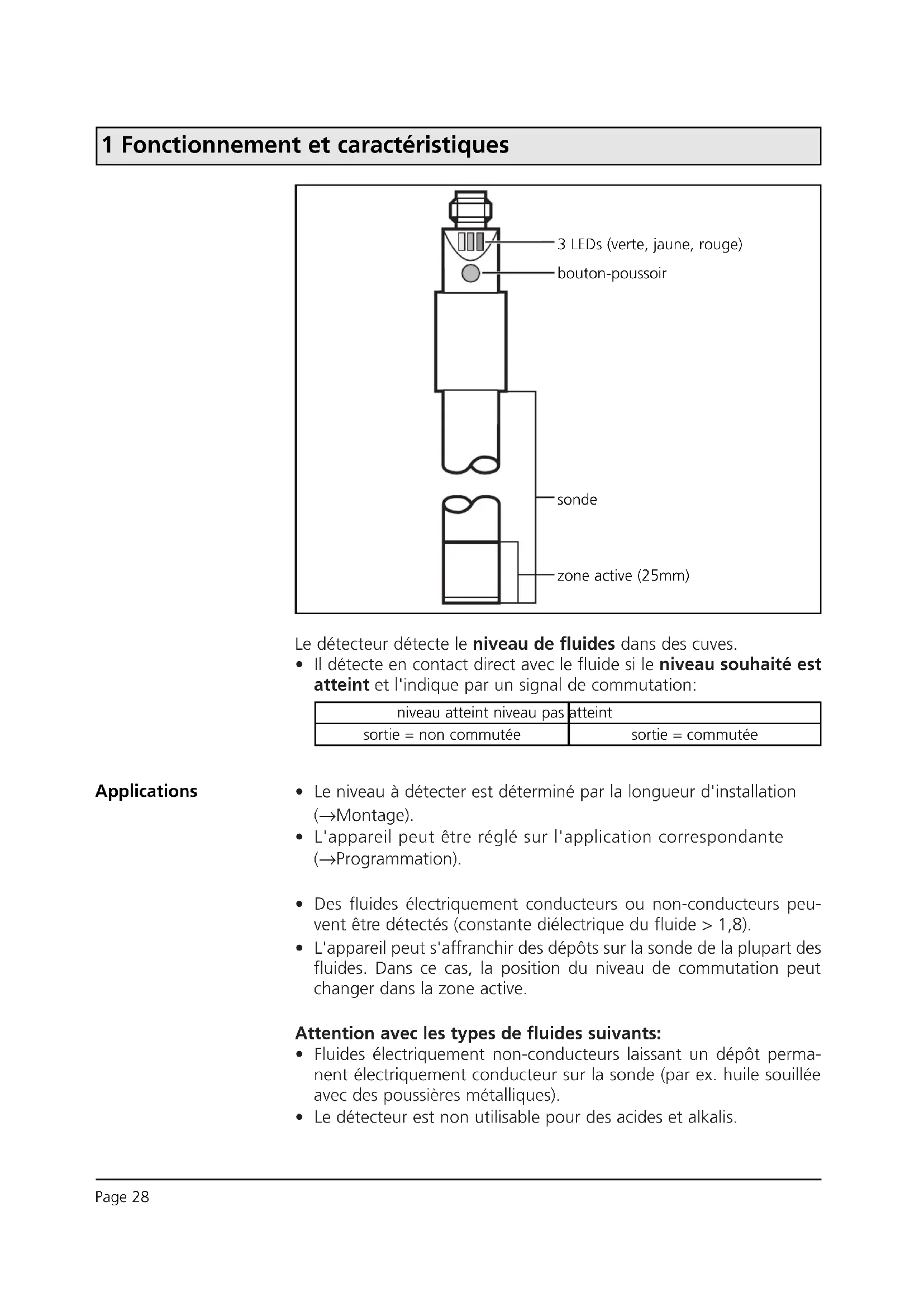 - Des fluides électriquement conducteurs ou non-conducteurs peu- vent être détectés (constante diélectrique du fluide > 1,8).