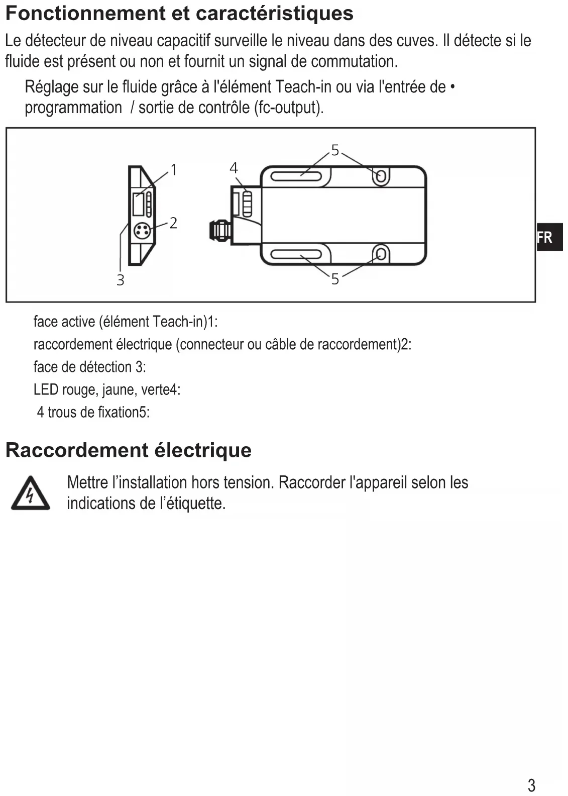 face active (élément Teach-in)1: raccordement électrique (connecteur ou câble de raccordement)2: face de détection 3: LED rouge, jaune, verte4: 4 trous de fixation5: Raccordement électrique Mettre l’installation hors tension. Raccorder l'appareil selon les indications de l’étiquette.4 Montage