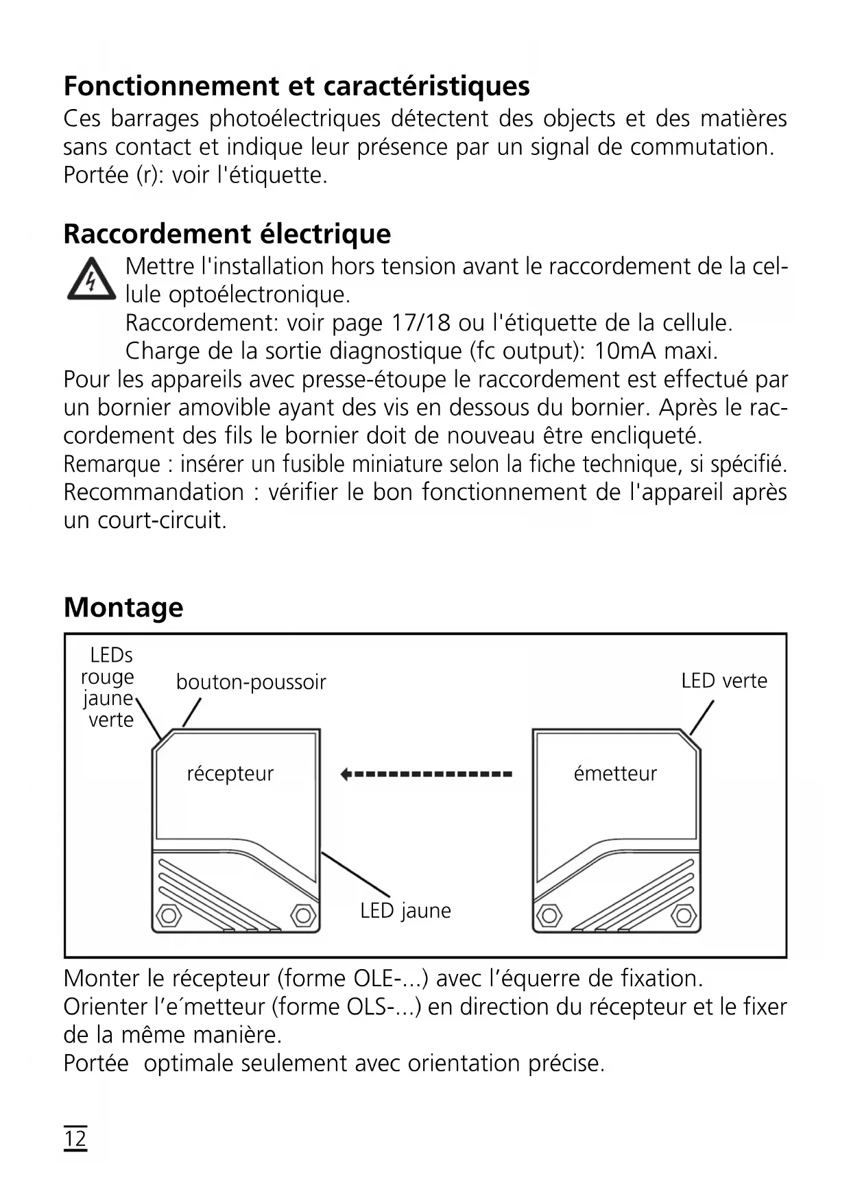 Press for 10s. The red LED starts to flash fast after 2s. Then the yellow and green LEDs flash alternately. After 8s all LEDs go off, the output function has chan- ged from light-on mode to dark-on mode (or vice versa). LED green is lit Unit is ready for operation. LED yellow is lit Output is switched. LEDs yellow + red Flash alternately, 2 Hz: output short-circuited. Flash alternately, 1 Hz: internal malfunction (output is not switched). LED red is lit Error in object detection, e.g. maladjustment, soiling of the lenses. receiverFonctionnement et caractéristiques Ces barrages photoélectriques détectent des objects et des matières sans contact et indique leur présence par un signal de commutation. Portée (r): voir l'étiquette. Raccordement électrique Mettre l'installation hors tension avant le raccordement de la cel- lule optoélectronique. Raccordement: voir page 17/18 ou l'étiquette de la cellule. Charge de la sortie diagnostique (fc output): 10mA maxi. Pour les appareils avec presse-étoupe le raccordement est effectué par un bornier amovible ayant des vis en dessous du bornier. Après le rac- cordement des fils le bornier doit de nouveau être encliqueté. Remarque : insérer un fusible miniature selon la fiche technique, si spécifié. Recommandation : vérifier le bon fonctionnement de l'appareil après un court-circuit. Montage Monter le récepteur (forme OLE-...) avec l’équerre de fixation. Orienter l’e´metteur (forme OLS-...) en direction du récepteur et le fixer de la même manière. Portée optimale seulement avec orientation précise.