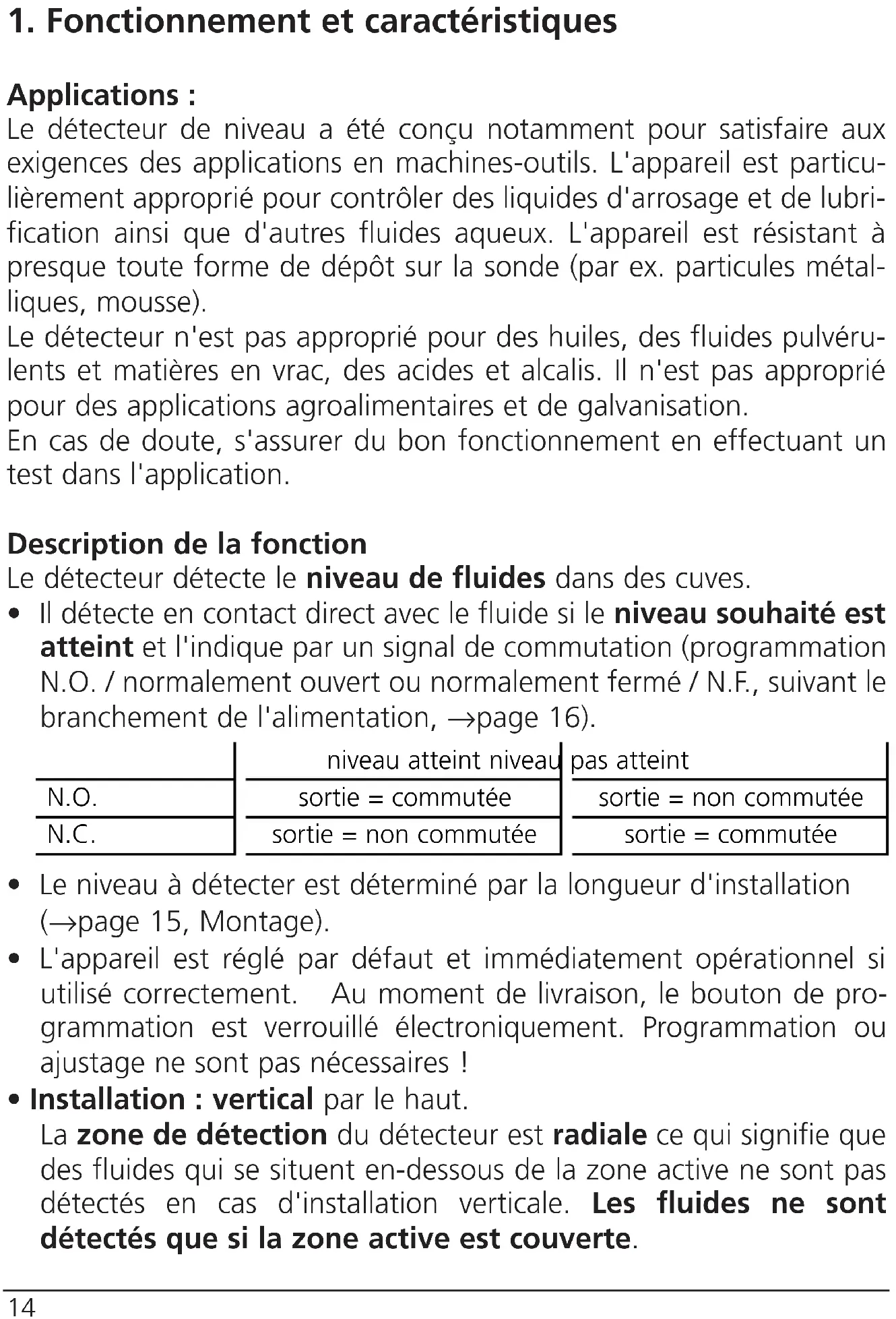 - Il détecte en contact direct avec le fluide si le niveau souhaité est atteint et l'indique par un signal de commutation (programmation N. O. / normalement ouvert ou normalement fermé / N. F., suivant le branchement de l'alimentation, → page 16).