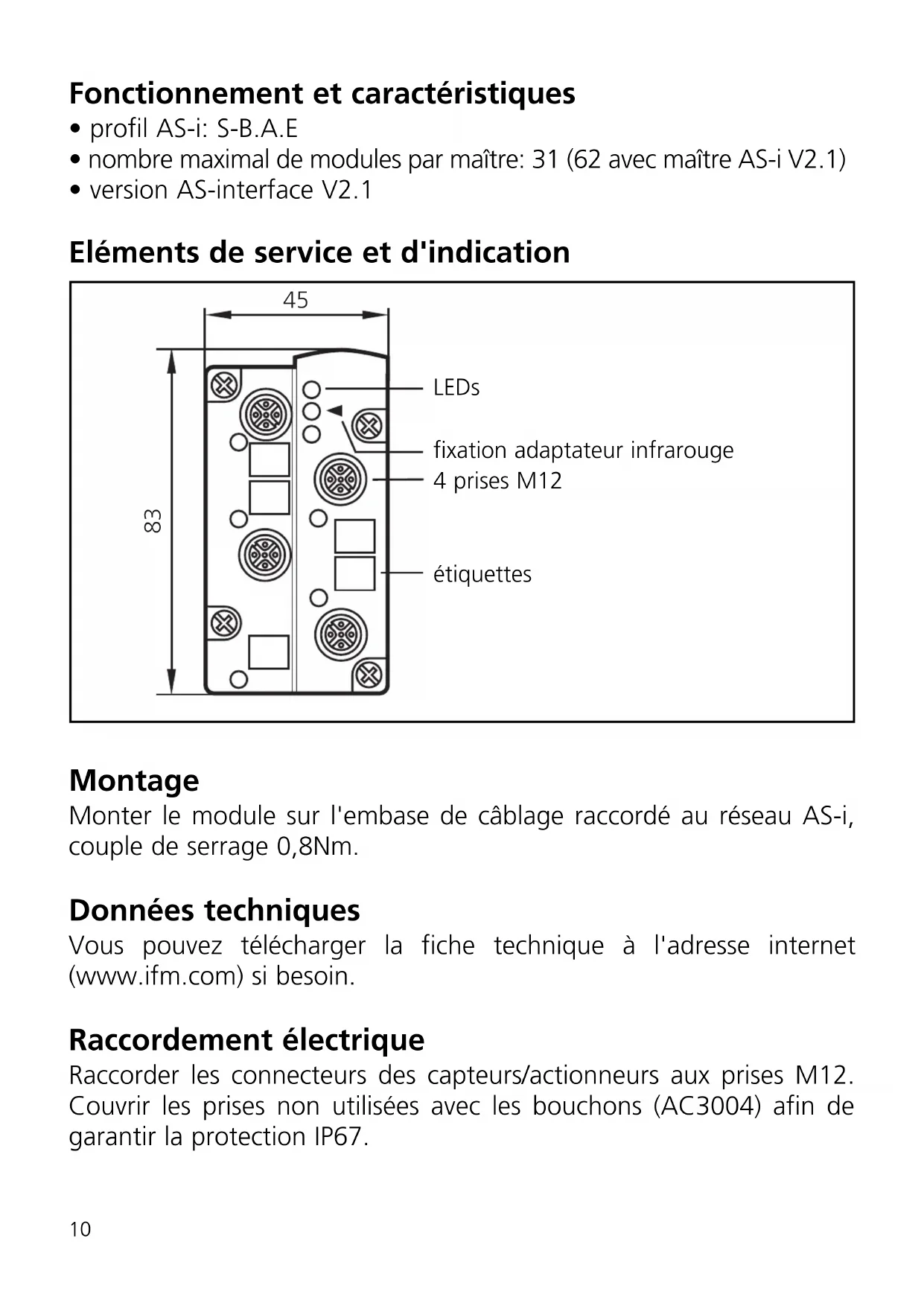 - version AS-interface V2.1 Eléments de service et d'indication Montage Monter le module sur l'embase de câblage raccordé au réseau AS-i, couple de serrage 0,8Nm. Données techniques Vous pouvez télécharger la fiche technique à l'adresse internet (www.ifm.com) si besoin. Raccordement électrique Raccorder les connecteurs des capteurs/actionneurs aux prises M12. Couvrir les prises non utilisées avec les bouchons (AC3004) afin de garantir la protection IP67.