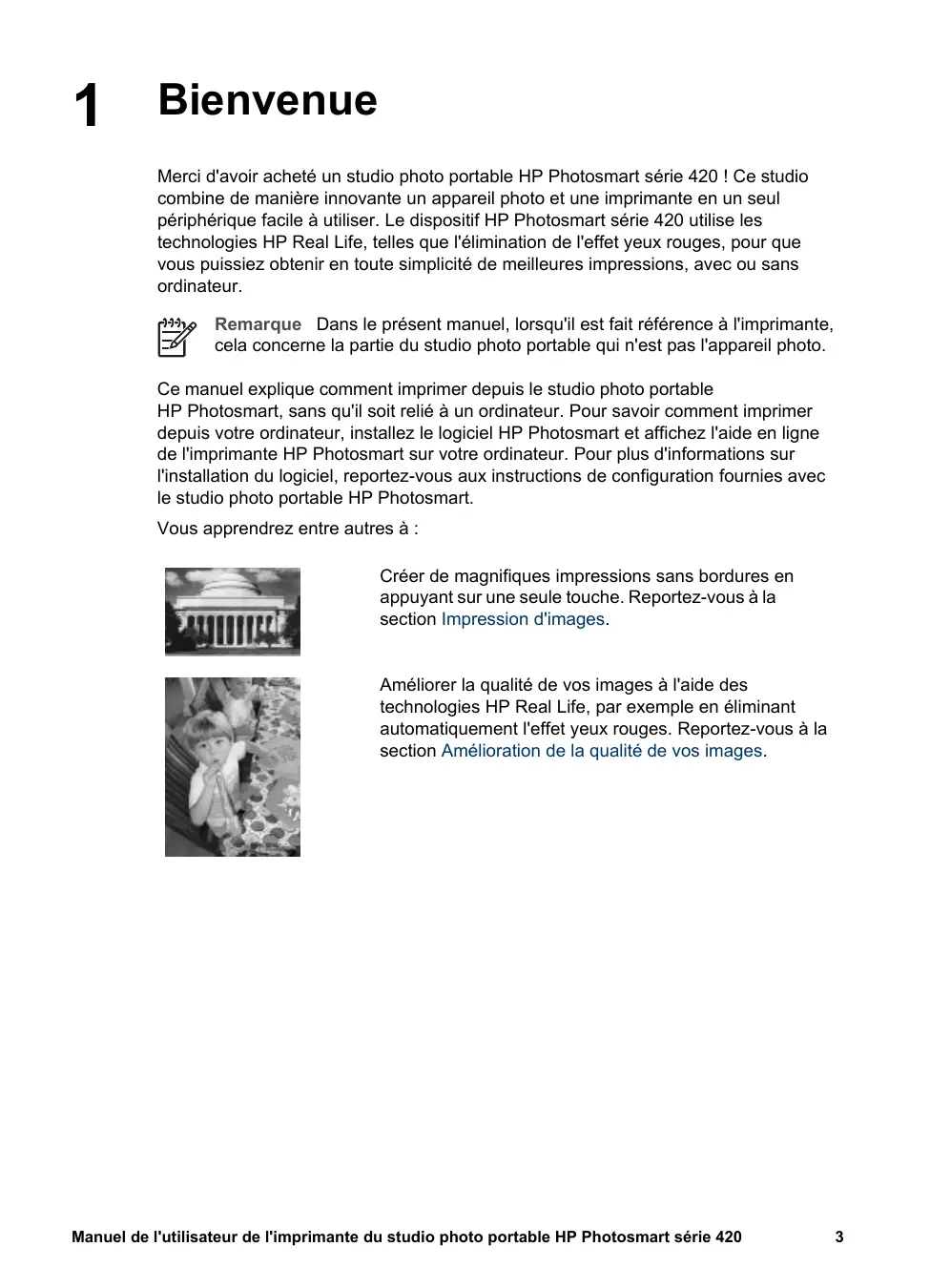 Bienvenue Merci d'avoir acheté un studio photo portable HP Photosmart série 420 ! Ce studio combine de manière innovante un appareil photo et une imprimante en un seul périphérique facile à utiliser. Le dispositif HP Photosmart série 420 utilise les technologies HP Real Life, telles que l'élimination de l'effet yeux rouges, pour que vous puissiez obtenir en toute simplicité de meilleures impressions, avec ou sans ordinateur. Remarque Dans le présent manuel, lorsqu'il est fait référence à l'imprimante, cela concerne la partie du studio photo portable qui n'est pas l'appareil photo. Ce manuel explique comment imprimer depuis le studio photo portable HP Photosmart, sans qu'il soit relié à un ordinateur. Pour savoir comment imprimer depuis votre ordinateur, installez le logiciel HP Photosmart et affichez l'aide en ligne de l'imprimante HP Photosmart sur votre ordinateur. Pour plus d'informations sur l'installation du logiciel, reportez-vous aux instructions de configuration fournies avec le studio photo portable HP Photosmart. Vous apprendrez entre autres à : Créer de magnifiques impressions sans bordures en appuyant sur une seule touche. Reportez-vous à la section Impression d'images. Améliorer la qualité de vos images à l'aide des technologies HP Real Life, par exemple en éliminant automatiquement l'effet yeux rouges. Reportez-vous à la section Amélioration de la qualité de vos images. Manuel de l'utilisateur de l'imprimante du studio photo portable HP Photosmart série 420