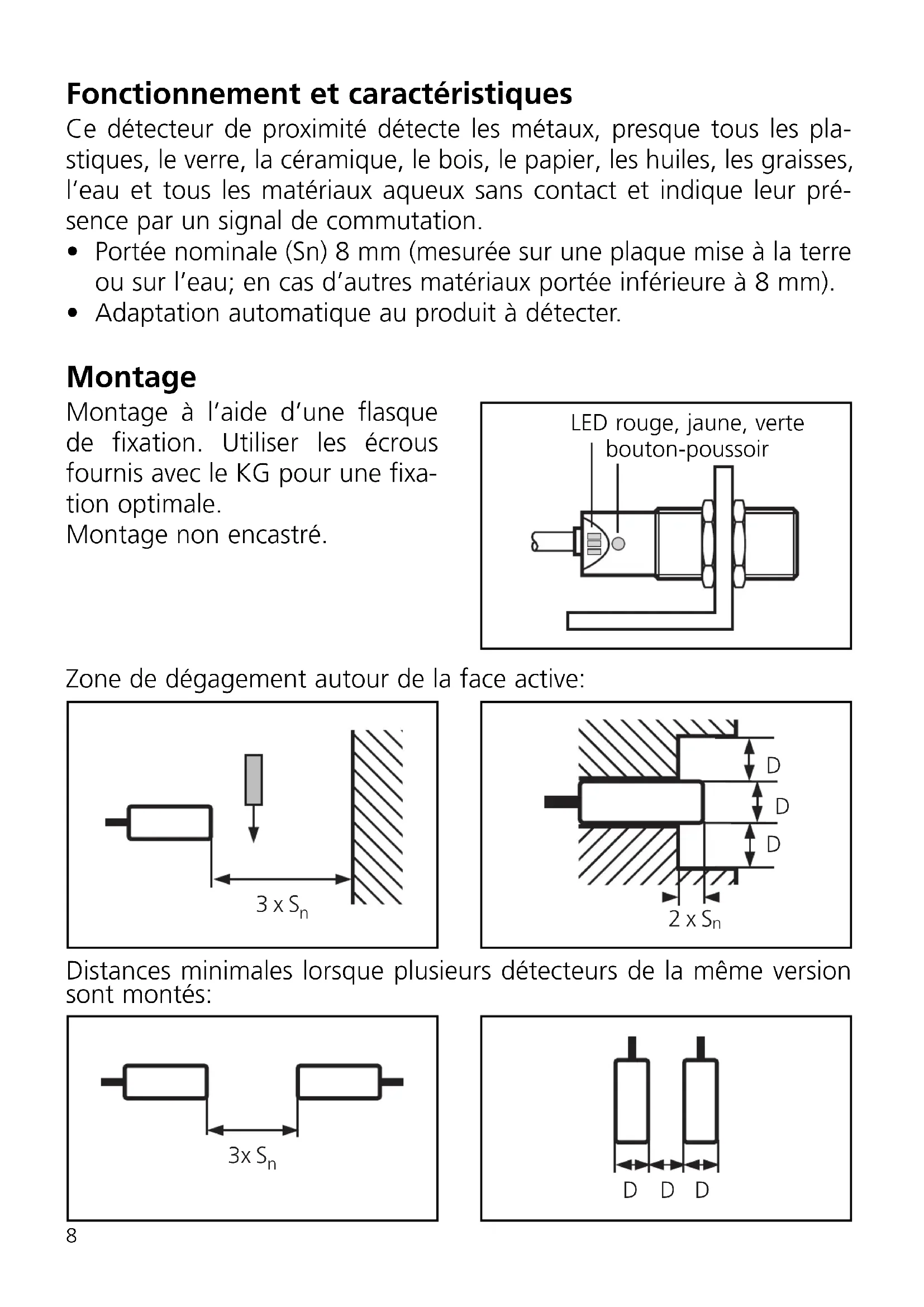 - Portée nominale (Sn) 8 mm (mesurée sur une plaque mise à la terre ou sur l’eau; en cas d’autres matériaux portée inférieure à 8 mm).