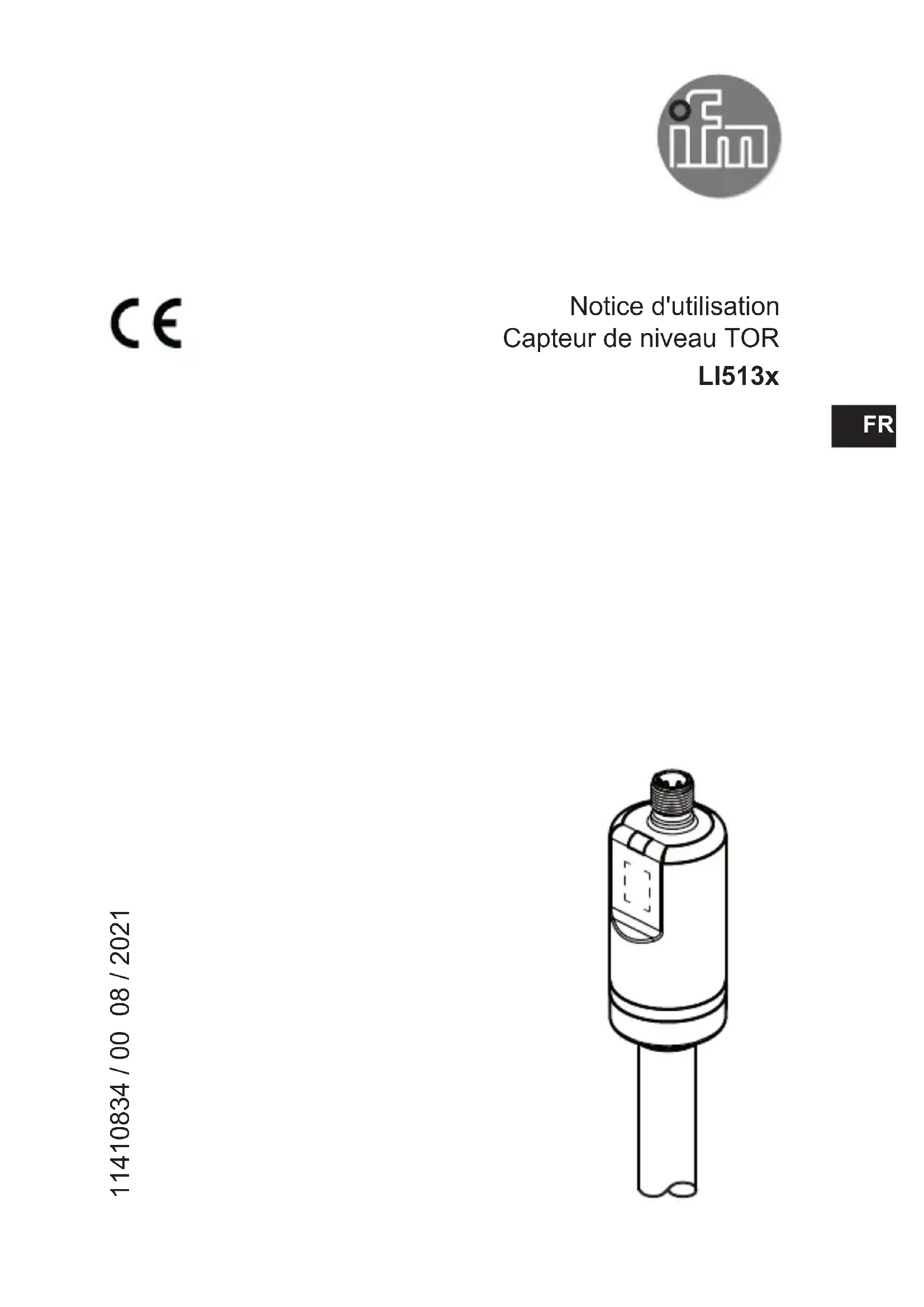 Notice d'utilisation Capteur de niveau TOR LI513x 11410834 / 00 08 / 2021 FRFR2 Contenu 1 Remarques préliminaires 3 11 Symboles utilisés 3 2 Consignes de sécurité 4 3 Fourniture 5 4 Fonctionnement et caractéristiques 5 41 Application 5 42 Restriction de l'application 5 5 Fonctions 6 51 Principe de mesure de niveau 6 52 Principe de mesure de température 6 53 Caractéristiques de l'appareil 7 531 IO-Link 7 54 Exemples d'applications 8 6 Montage 9 61 Lieu de montage / environnement de montage 9 62 Processus de montage 9 63 Définition de la longueur d'installation / longueur d'extension 10 7 Raccordement électrique 11 8 Eléments de service et d'indication 12 9 Paramétrage 12 91 Paramétrage via bouton d'apprentissage 13 911 Déverrouiller l'appareil 13 912 Effectuer le réglage vide 14 913 Effectuer le réglage plein 15 92 Paramétrage via IO-Link 16 921 Paramétrage via PC et maître IO-Link USB 16 922 Paramétrage via le Memory Plug 16 923 Paramétrage pendant le fonctionnement 16 924 Paramètres réglables et commandes de système 17 925 Exemple de paramétrage via IO-Link 19 10 Fonctionnement 20 101 Vérifier la fonction 203