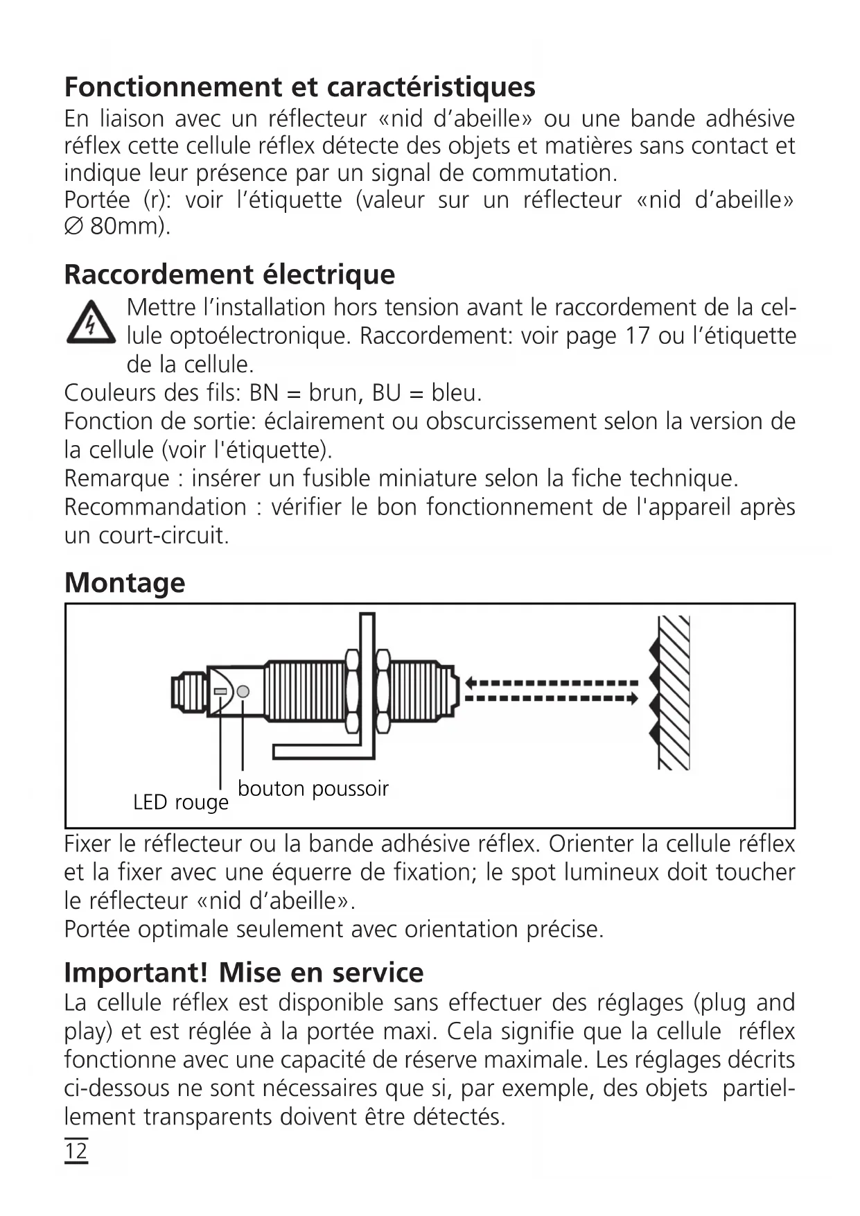 Press for 10s. The red LED starts to flash rapidly after 2s. After that the LED flashes slowly for approx. 8s. When the LED goes out the unit is locked. Press for 10s. After 10s the LED goes out, locking is cancelled.ENGLISH Units with dark-on mode (normally open) The unit receives no light reflected by the prismatic reflector → LED is on, output switched: object present (certain range). The unit receives very little light reflected by the prismatic reflector → LED flashes (1 Hz), output switched: object present (uncertain range). The unit receives light reflected by the prismatic reflector → LED off, output not switched: no object detected. Maintenance Keep the lens of the sensor free from soiling. For cleaning do not use any solvents or cleaning agents which could damage the plastic lens- es. 11Fonctionnement et caractéristiques En liaison avec un réflecteur «nid d’abeille» ou une bande adhésive réflex cette cellule réflex détecte des objets et matières sans contact et indique leur présence par un signal de commutation. Portée (r): voir l’étiquette (valeur sur un réflecteur «nid d’abeille» ∅ 80mm). Raccordement électrique Mettre l’installation hors tension avant le raccordement de la cel- lule optoélectronique. Raccordement: voir page 17 ou l’étiquette de la cellule. Couleurs des fils: BN = brun, BU = bleu. Fonction de sortie: éclairement ou obscurcissement selon la version de la cellule (voir l'étiquette). Remarque : insérer un fusible miniature selon la fiche technique. Recommandation : vérifier le bon fonctionnement de l'appareil après un court-circuit. Montage Fixer le réflecteur ou la bande adhésive réflex. Orienter la cellule réflex et la fixer avec une équerre de fixation; le spot lumineux doit toucher le réflecteur «nid d’abeille». Portée optimale seulement avec orientation précise. Important! Mise en service La cellule réflex est disponible sans effectuer des réglages (plug and play) et est réglée à la portée maxi. Cela signifie que la cellule réflex fonctionne avec une capacité de réserve maximale. Les réglages décrits ci-dessous ne sont nécessaires que si, par exemple, des objets partiel- lement transparents doivent être détectés.