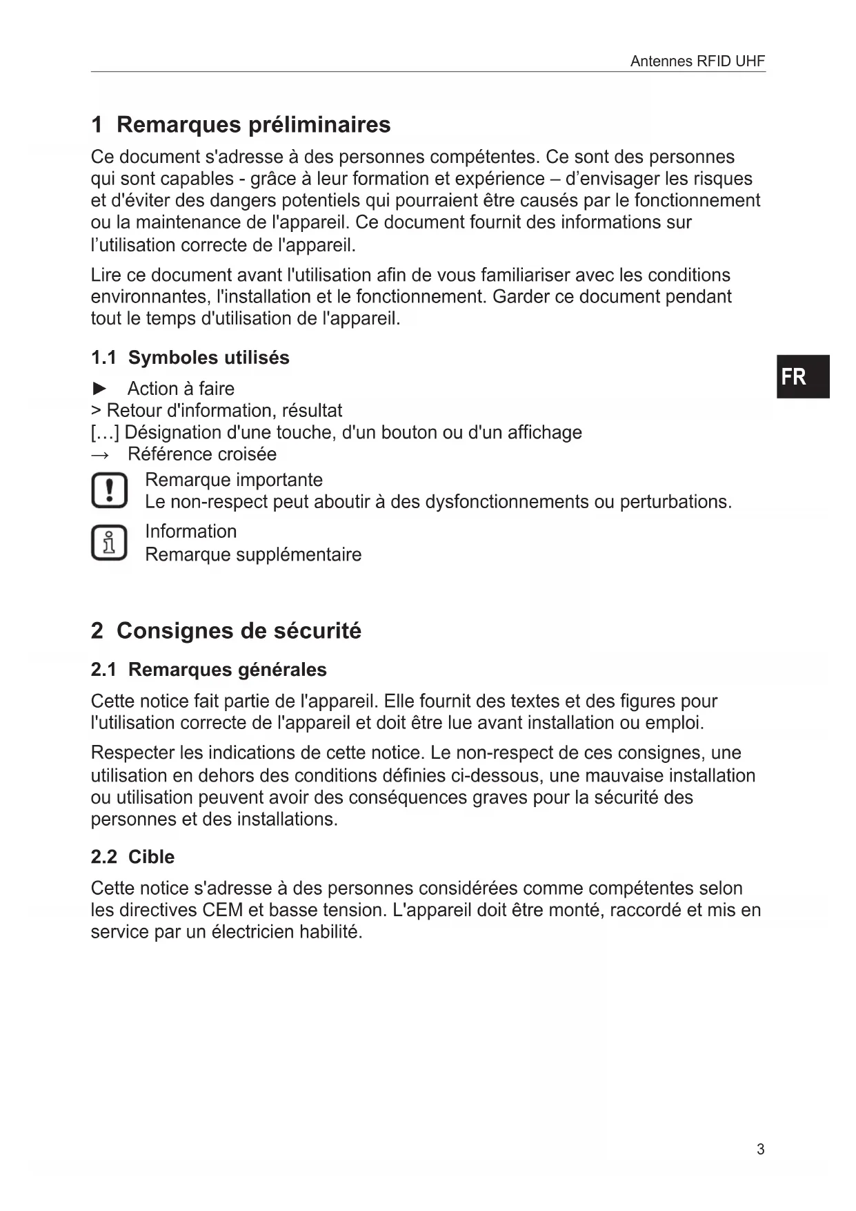 Cette notice s'adresse à des personnes considérées comme compétentes selon les directives CEM et basse tension L'appareil doit être monté, raccordé et mis en service par un électricien habilitéAntennes RFID UHF