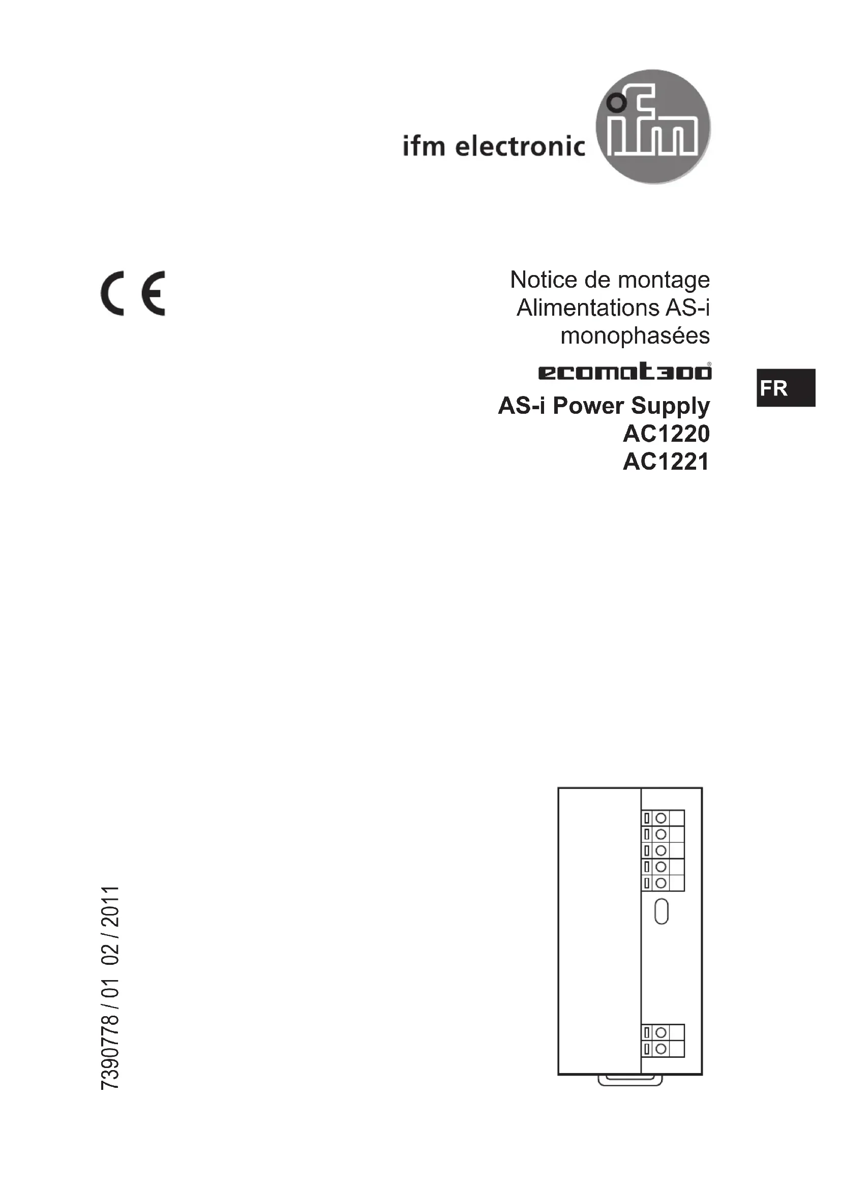 Notice de montage Alimentations AS-i monophasées AS-i Power Supply AC1220 AC1221 7390778 / 01 02 / 2011 FR2 Contenu 1 Remarque préliminaire 3 11 Remarques sur ce document 3 12 Symboles utilisés 3 13 Avertissements utilisés 3 2 Consignes de sécurité 4 21 Général 4 22 Montage et raccordement électrique 4 23 Interventions sur l'appareil 4 3 Fonctionnement et caractéristiques 4 4 Montage 5 41 Position de montage de l'appareil 5 42 Fixer l'appareil sur le rail profilé DIN 6 43 Démonter l'appareil 6 5 Raccordement électrique 7 51 Utilisation des bornes à ressort 7 52 Sections transversales du fil 8 53 Fusible externe 8 54 Borne Shield 8 6 Eléments de service et d'indication 8 61 Etats LED9 7 Fonctionnement 9 8 Données techniques 9 81 Fiches techniques 9 9 Maintenance, réparation et élimination 9 10 Homologations/normes 103
