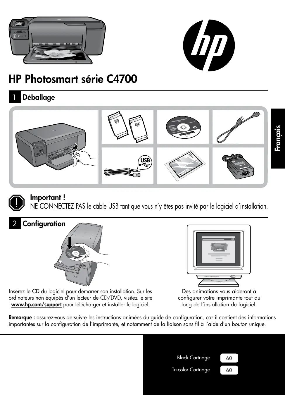 Remarque : assurez-vous de suivre les instructions animées du guide de configuration, car il contient des informations importantes sur la configuration de l’imprimante, et notamment de la liaison sans fil à l’aide d’un bouton unique.