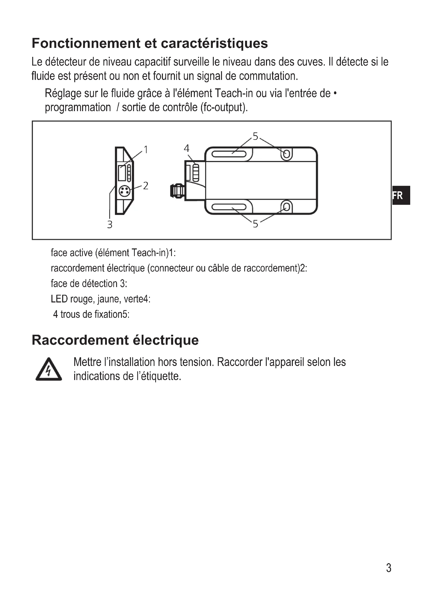 face active (élément Teach-in)1: raccordement électrique (connecteur ou câble de raccordement)2: face de détection 3: LED rouge, jaune, verte4: 4 trous de fixation5: Raccordement électrique Mettre l’installation hors tension. Raccorder l'appareil selon les indications de l’étiquette.4 Montage