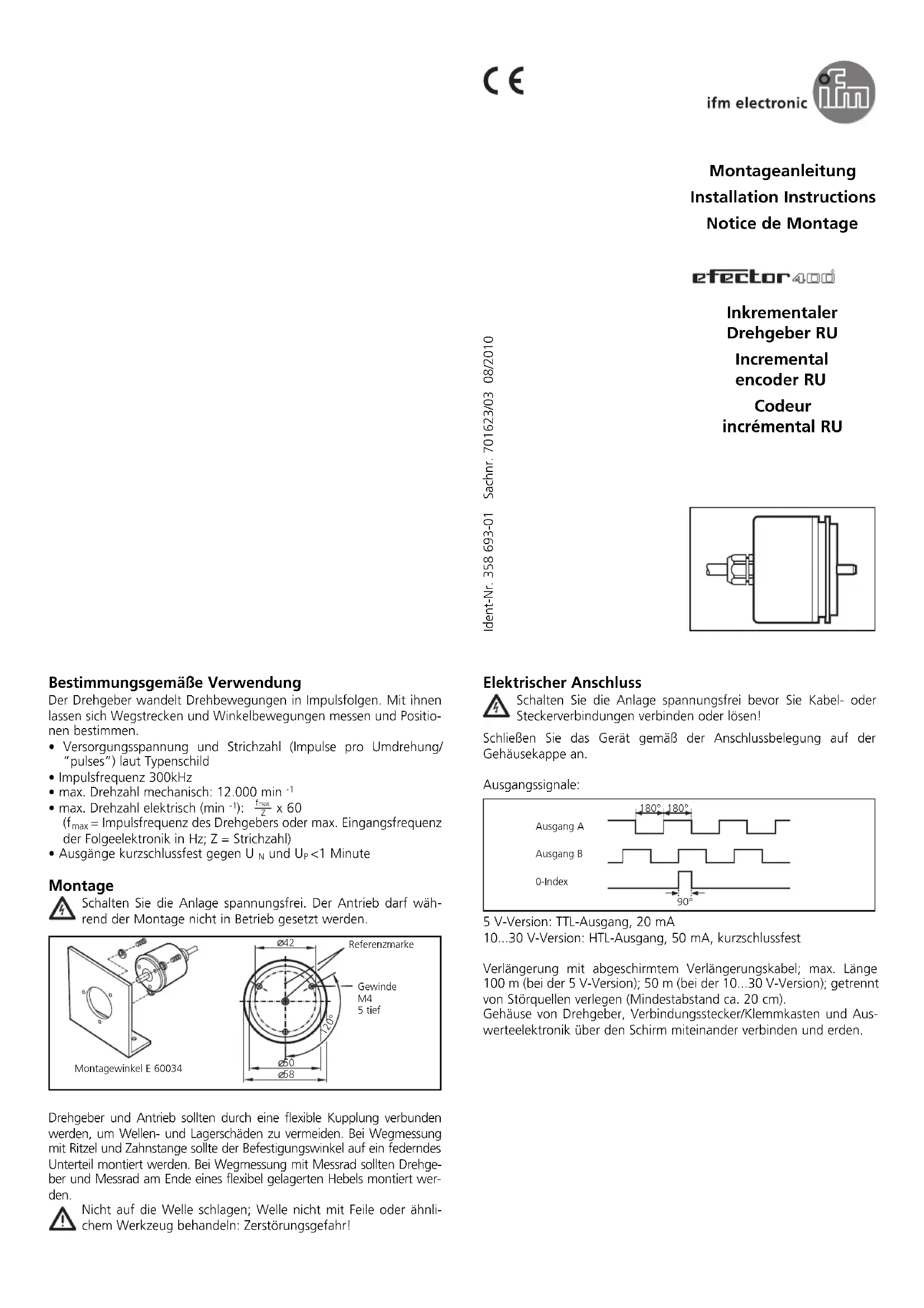 - V); installer séparément des sources parasites (distance minimale env. 20 cm). Relier le boîtier du codeur, le connecteur/le bornier et l’électronique d’exploitation via le blindage et relier à la terre. Electrical connection Disconnect power before connecting or disconnecting the cable or connector. Connect the unit according to the wiring indicated on the housing. Output signals: 5 V version: TTL output, 20 mA 10 p. 30