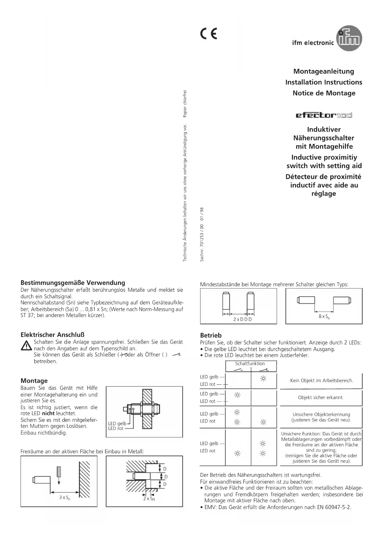 LED gelb — LED rot — — Schaltfunktion Kein Objekt im Arbeitsbereich. LED gelb — LED rot — — Objekt sicher erkannt. LED gelb — LED rot Unsichere Objekterkennung (justieren Sie das Gerät neu). LED gelb — LED rot Unsichere Funktion: Das Gerät ist durch Metallablagerungen vorbedämpft oder die Freiräume an der aktiven Fläche sind zu gering; (reinigen Sie die aktive Fläche oder justieren Sie das Gerät neu). LED gelb LED rot Sachnr. 701253 / 00 01 / 98Function and features This proximity switch detects metals without contact and indicates their presence by providing a switched signal. The nominal sensing range (Sn) can be seen in the type designation on the type label on the unit; operating distance (Sa) 0 ... 0,81 x Sn; (values based on standard measurement with mild steel; a shorter sensing range for other metals). Electrical connection Disconnect power before connecting the proximity switch. Connection strictly to the indications on the type label. The unit can be used as normally open ( ) or as normally closed ( ). Installation Mounting by means of a mount- ing device. Adjust the unit. Adjustment is correct when the red LED does not light. Secure by means of the nuts pro- vided so that it cannot work loose. Non-flush installation. Open space around the sensing face when mounted in metal: Fonctionnement et caractéristiques Ce détecteur de proximité détecte les métaux sans contact et indique leur présence par un signal de commutation. Pour la portée nominale (Sn) voir la désignation sur l’étiquette, portée de travail (Sa) 0 ... 0,81 x Sn; (valeurs définies par mesure selon les normes avec acier 37; en cas d’autres métaux portée inférieure à Sn). Raccordement électrique Mettre l’installation hors tension avant le raccordement du détecteur de proximité. Raccordement strictement selon les indications de l’étiquette. L'appareil peut être utilisé en normalement ouvert normalement fermé ( ). Montage Montage à l’aide d’une flasque de fixation. Ajuster l'appareil. Le réglage est correct lorsque la LED rouge n'est pas allumée. Utiliser les écrous fournis pour une fixation optimale. Montage non encastré. Zone de dégagement autour de la face active pour montage sur bâti métallique: Distances minimales lorsque plusieurs détecteurs de la même version sont montés: Fonctionnement Vérifier le bon fonctionnement du détecteur. Indication par LED: