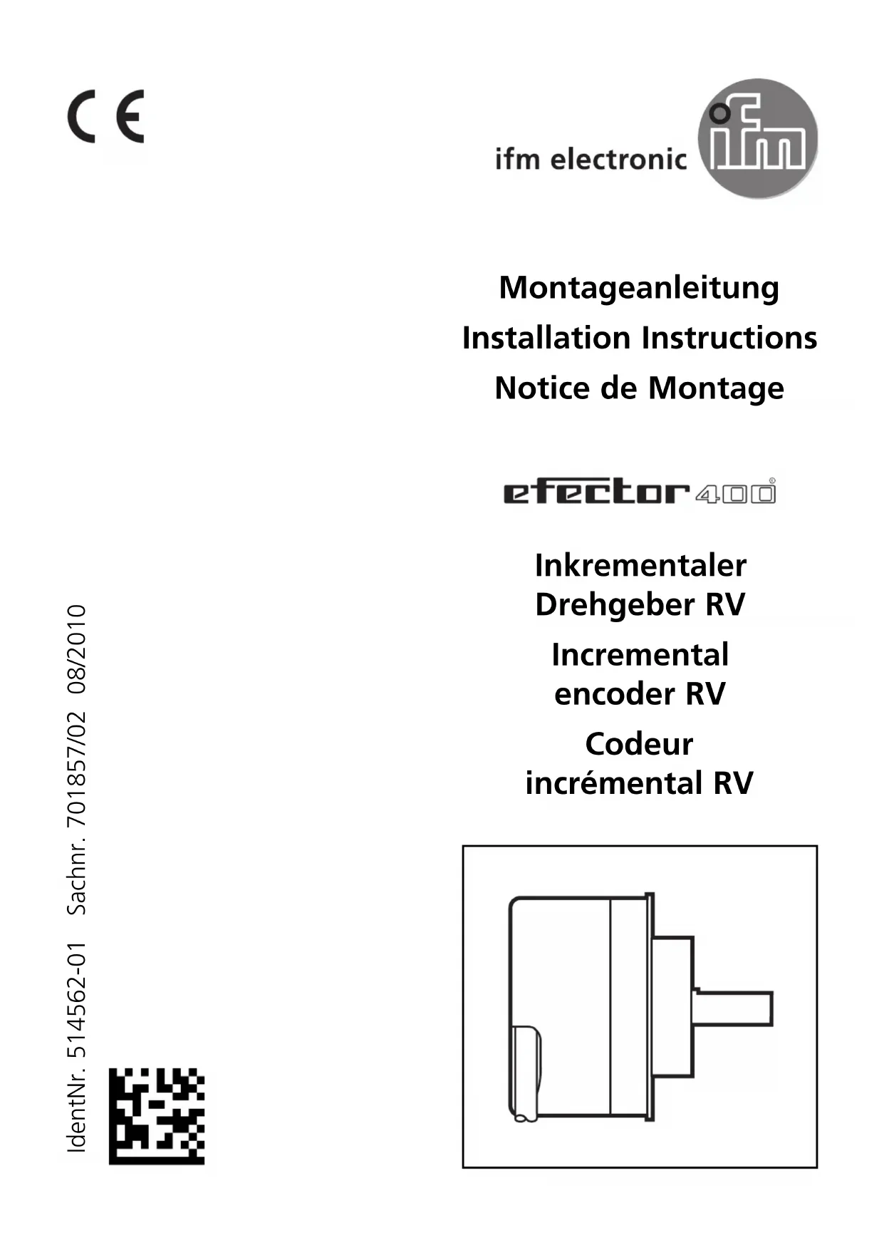 180° 180° 90° sortie A sortie B index 0Des déplacements linéaires peuvent être convertis en un mouvement de rotation avec une roue de mesure ou avec un pignon et une cré- maillère. Lors du montage les sollicitations maximales permises de l'arbre du codeur doivent être prises en considération. Le montage du flasque de fixation sur une base à ressort protège le codeur contre des sollicitations trop fortes dues aux matières rugueuses. Vous trouvez la fiche technique, d'autres documents et des accessoires appropriés sur notre site web à www.ifm.com.